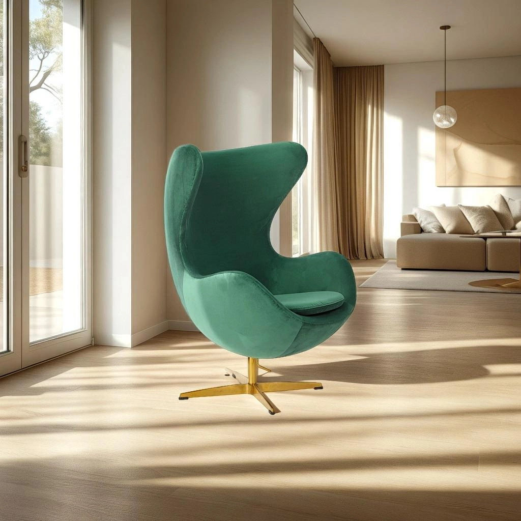 Wyjątkowy, organiczny kształt inspirowany klasycznym „Egg Chair” wprowadza do wnętrza nutę luksusu i nowoczesności. Zielona, welurowa tapicerka jest nie tylko niezwykle miła w dotyku, ale także pięknie odbija światło, tworząc efekt głębi i elegancji. Złota, pojedyncza noga ze stali podkreśla unikalny charakter fotela, czyniąc go prawdziwą ozdobą każdego salonu czy reprezentacyjnego gabinetu. Ten model doskonale komponuje się z aranżacjami glamour oraz nowoczesnymi przestrzeniami, stanowiąc mocny, stylowy akcent.