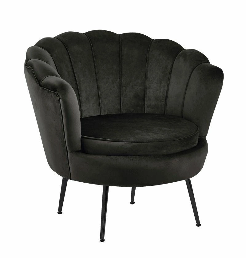 Kształt kubełkowego fotela Korab VIC inspirowany jest muszlą, co nie tylko przyciąga wzrok, ale również sprzyja komfortowi siedzenia. Oparcie i podłokietniki tworzą harmonijną całość, zapewniając stabilność i wygodę przy każdej okazji — podczas czytania, spotkań ze znajomymi czy chwili dla siebie z ulubioną kawą. Welwetowa tapicerka w głębokim, czarnym odcieniu nadaje wnętrzu luksusowy charakter, a subtelny połysk materiału podkreśla wyrafinowanie stylu glamour.