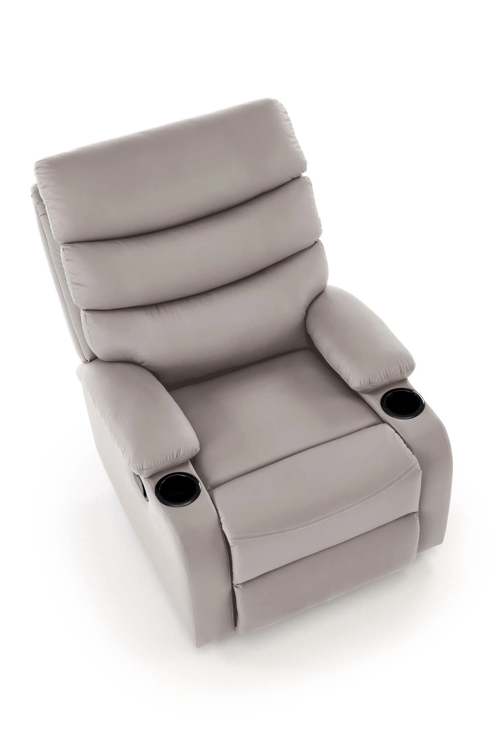 Fotel wykonano z wysokiej jakości skóry ekologicznej, która jest nie tylko miła w dotyku, ale także niezwykle łatwa do utrzymania w czystości. To szczególnie ważne w codziennym użytkowaniu – wystarczy wilgotna szmatka z delikatnym detergentem, by usunąć ewentualne zabrudzenia powstałe podczas spożywania posiłków czy napojów. Wbudowany uchwyt na napój sprawia, że można bez obaw delektować się ulubioną kawą czy sokiem podczas odpoczynku. Przykładem zastosowania może być wieczór z rodziną, kiedy każdy ma pod ręką swój napój i przekąski, a ryzyko przypadkowego rozlania jest minimalne.