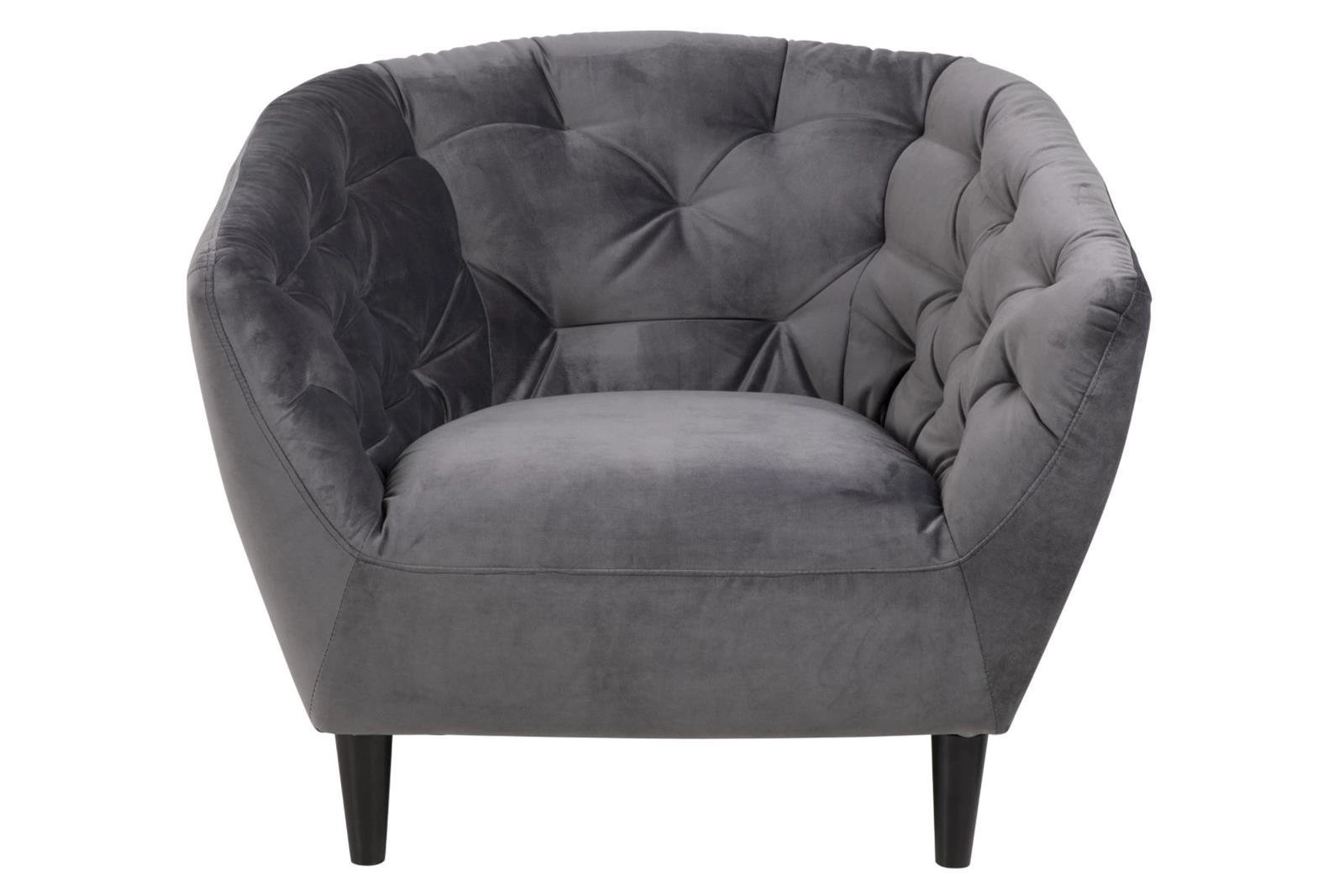 Fotel Ria to wyjątkowo przytulny fotel z eleganckim pikowanym siedziskiem. Miękka welwetowa tkanina VIC kolor dark grey 28 jest niezwykle przyjazna w dotyku i przytulna. Ozdobione siedzisko pikowaniami nawiązuje do stylu glamour. Podstawą fotela są drewniane kauczukowe nogi pomalowane na czarno. Fotel występuje również w innych kolorach. Dopełnieniem do fotela może być również sofa z tej samej serii. Waga: 23,5 kg.