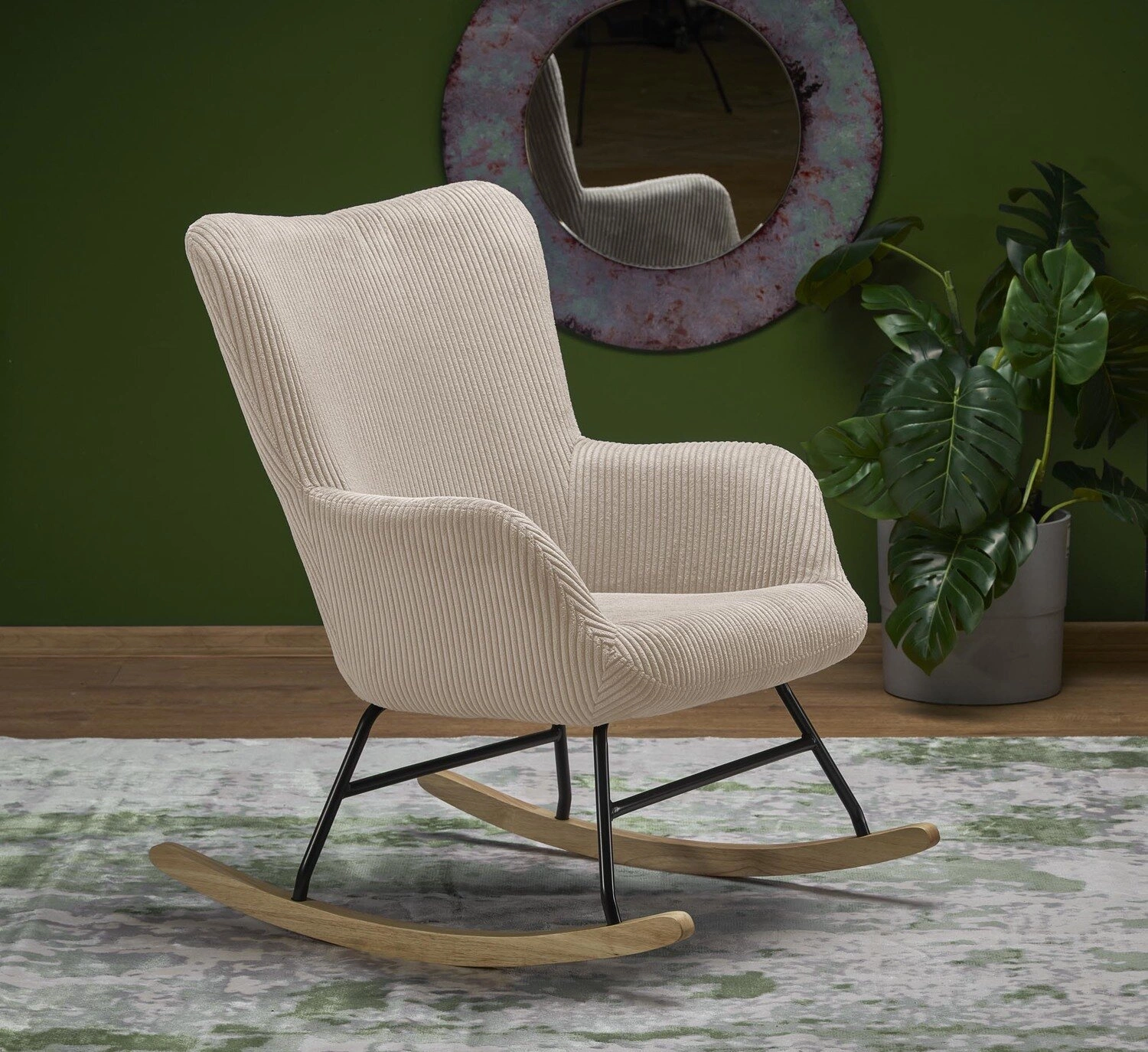 - Wykonany z wysokiej jakości tkaniny sztruksowej, pianki tapicerskiej, stali malowanej proszkowo i litego drewna