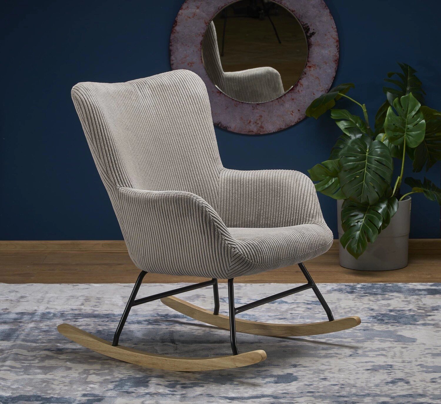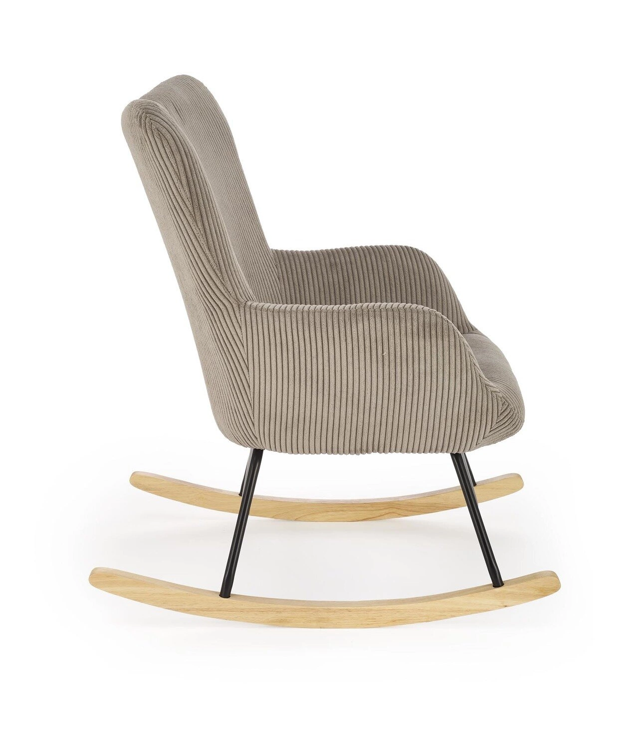 - Wysoka jakość wykonania: fotel wykonany z najlepszych materiałów, w tym tkaniny sztruksowej, stali malowanej proszkowo i litego drewna