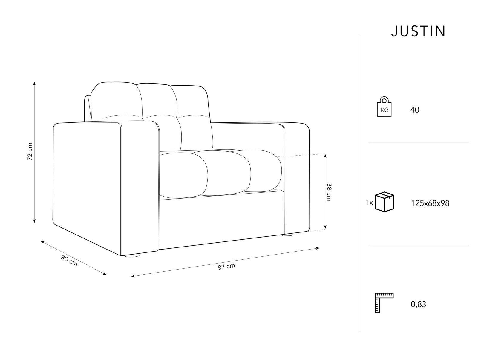 Fotel Justin Grey Velvet doskonale sprawdzi się zarówno w sypialni, salonie, przedpokoju, pokoju młodzieżowym, garderobie, gabinecie, biurze, jak i poczekalni. Dzięki swojemu nowoczesnemu, glamour oraz holenderskiemu stylowi, doda on niepowtarzalnego charakteru każdemu pomieszczeniu. Jego szerokość wynosi 90 cm, a wysokość siedziska 38 cm, co zapewnia komfort podczas użytkowania.