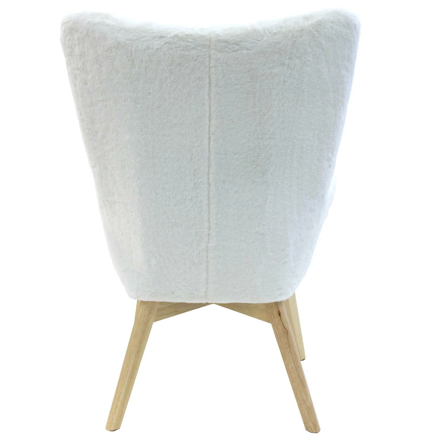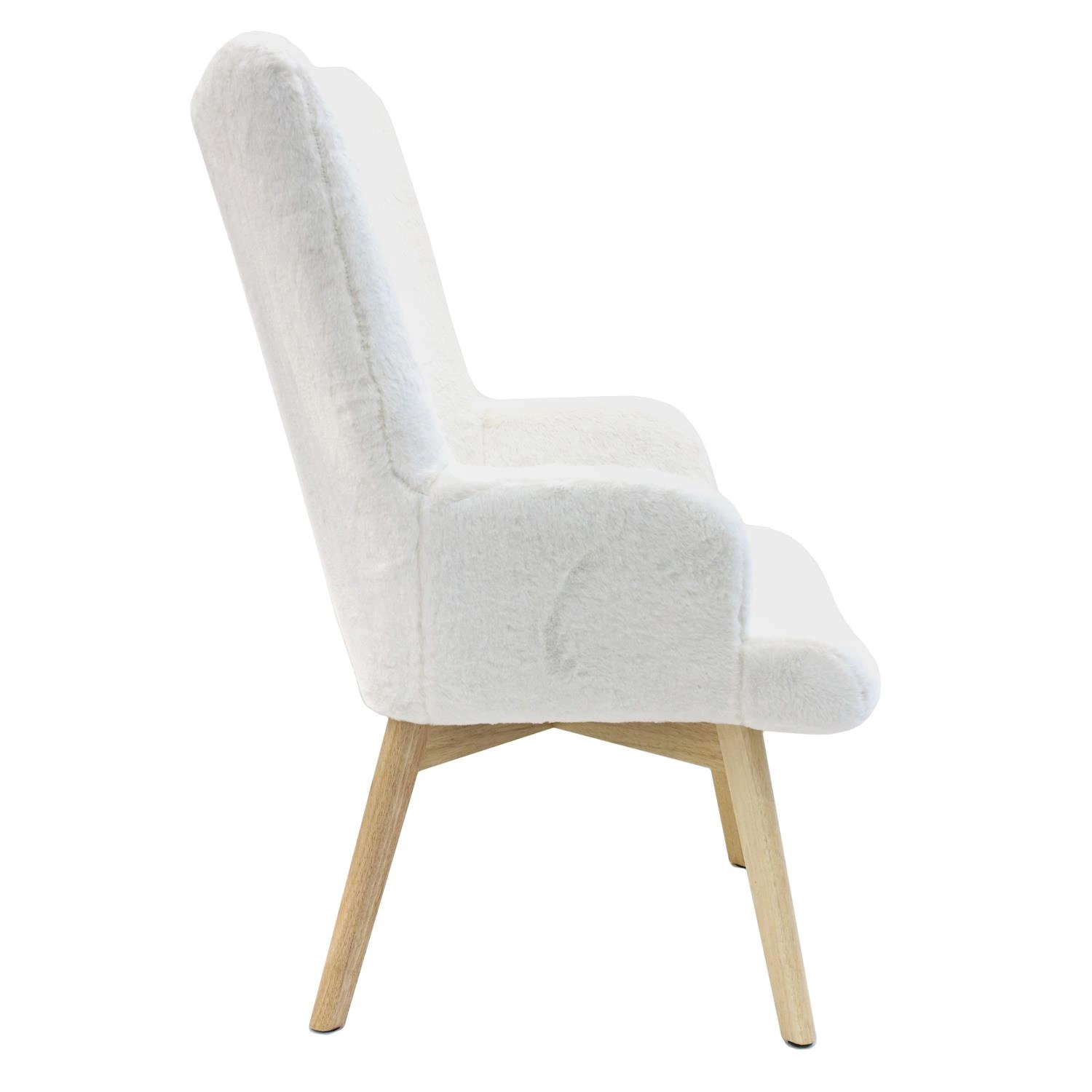 - Fotel na drewnianych, kauczukowych nóżkach w naturalnym kolorze, pokryty białą, ozdobną tkaniną.