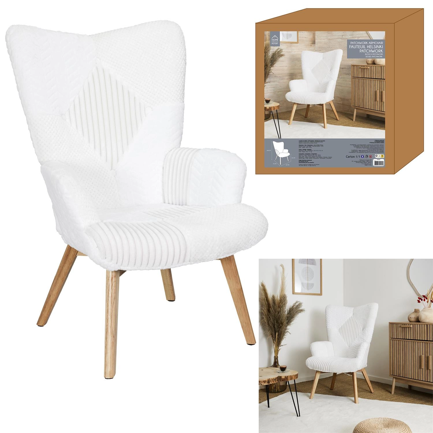 Fotel uszak Helsinki biały patchwork - połączenie wygody i stylu