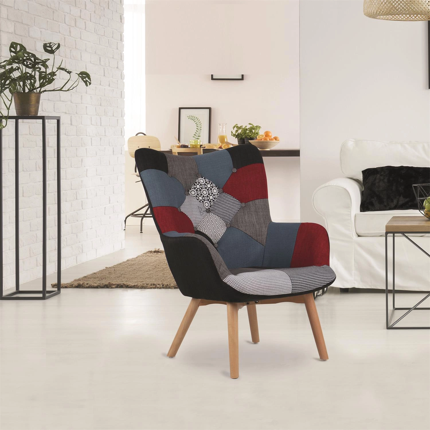 - Stylowy i wygodny fotel uszak w kolorystyce patchwork