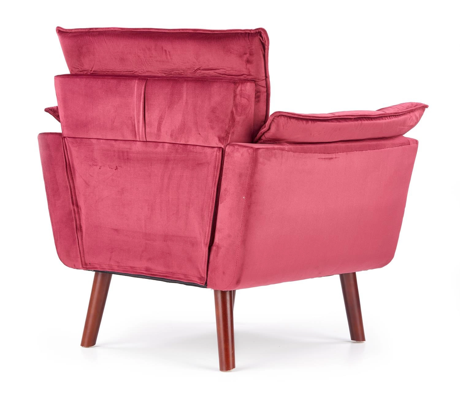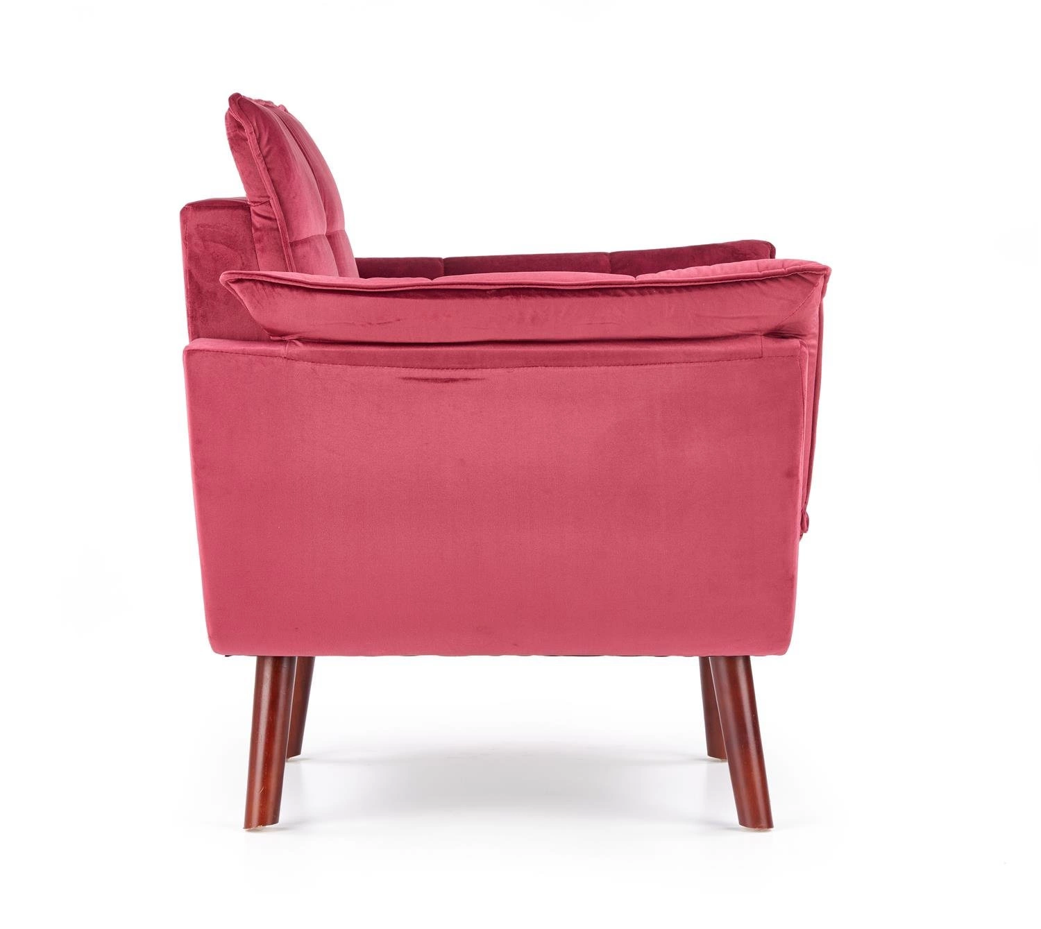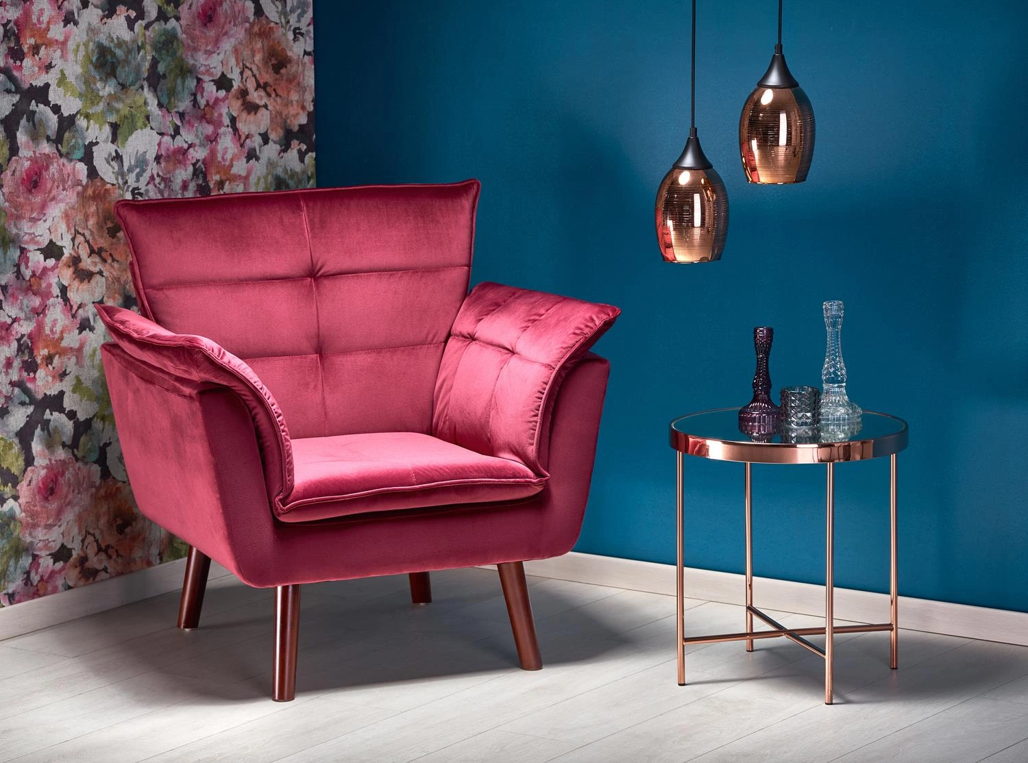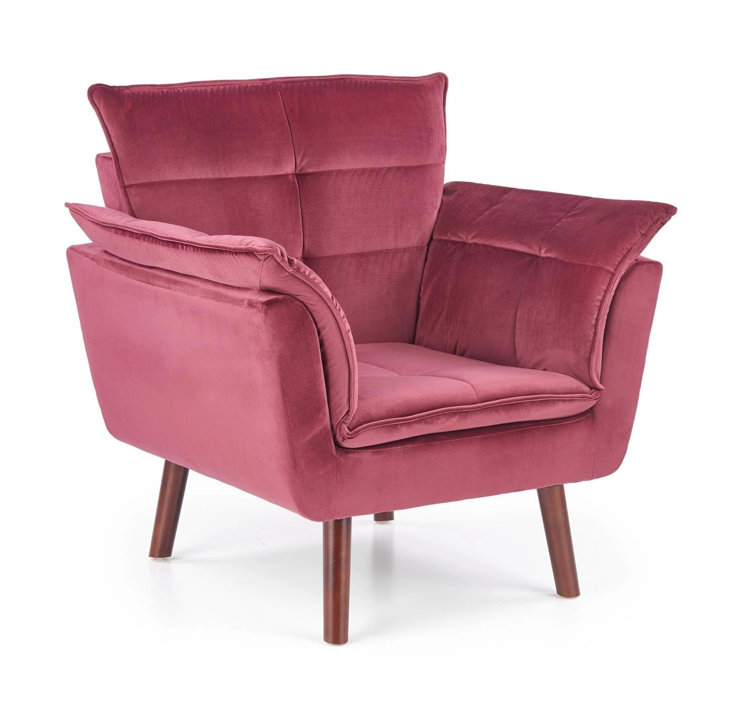 Fotel wypoczynkowy Jambo marki Intesi to połączenie nowoczesnej elegancji z komfortem na najwyższym poziomie. Wykonany z miękkiego weluru w głębokim bordowym kolorze, posiada szerokie siedzisko, ergonomiczne podłokietniki oraz solidną, drewnianą podstawę w odcieniu ciemnego brązu. Dzięki kompaktowym wymiarom (szerokość 80 cm, głębokość 73 cm, wysokość 84 cm) idealnie sprawdzi się zarówno w salonie, jak i sypialni, zapewniając wygodę podczas relaksu czy czytania książki.