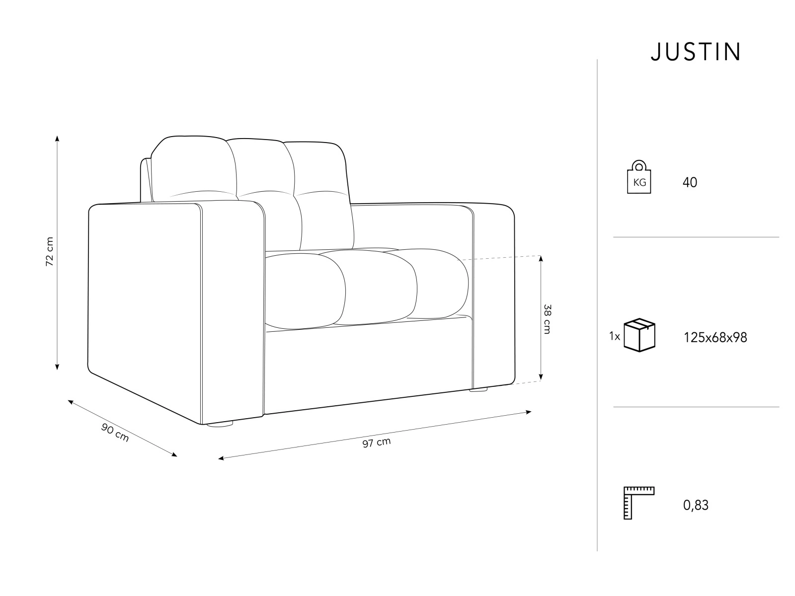 Justin Light Grey Velvet to fotel o wysokości siedziska 38 cm i szerokości 90 cm. Jego obicie wykonane jest z przyjemnej w dotyku tkaniny welwetowej w szarym kolorze. Fotel posiada cztery nogi, które zapewniają stabilność. Jego podłokietniki zwiększają komfort podczas siedzenia, a maksymalne obciążenie wynoszące 150 kg gwarantuje solidność i wytrzymałość.