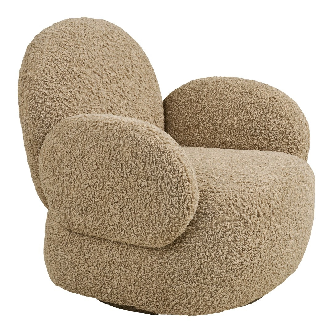 Fotel wypoczynkowy obrotowy Messina marki House Nordic to jasnobrązowy fotel do salonu o wysokości 81 cm, wykończony miękkim futrzanym materiałem. Szerokie siedzisko 85×87 cm oraz obrotowa podstawa zapewniają wygodę na co dzień – od popołudniowego relaksu po wieczorne czytanie.