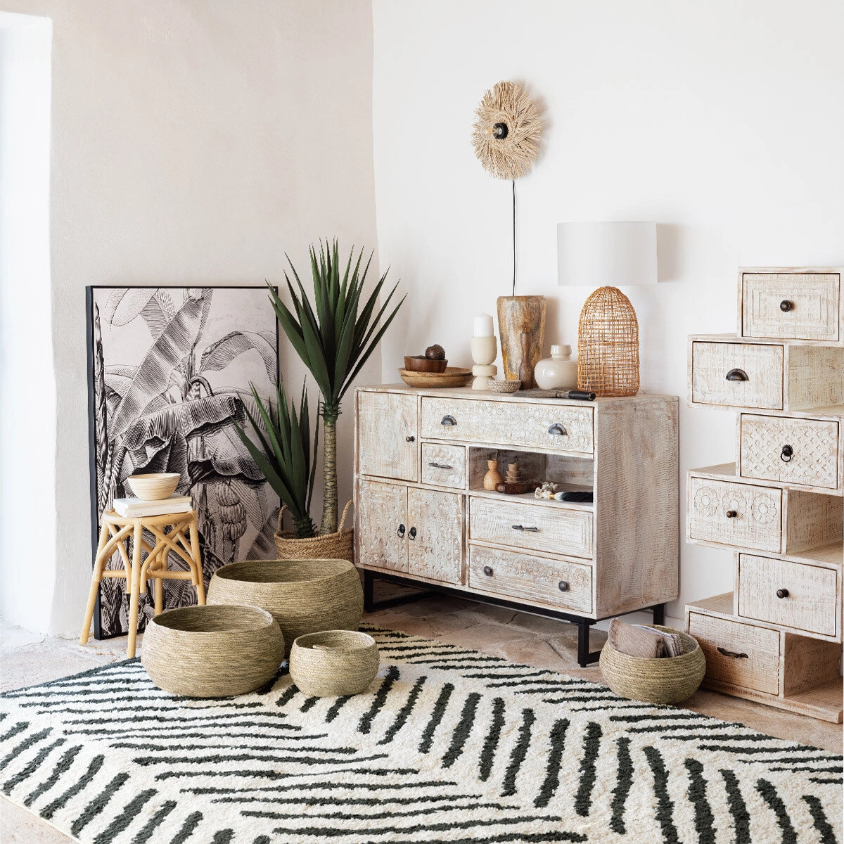 Komoda Ajay 115 cm beżowa marki Atmosphera to wyjątkowy mebel z orientalnym charakterem, wykonany z naturalnego drewna mango i osadzony na czarnych metalowych płozach. Jej strukturalny front, nietuzinkowe wykończenie i praktyczna szerokość 115 cm sprawiają, że to komoda do salonu, sypialni lub jadalni, która łączy wyrazisty styl z funkcjonalnością.