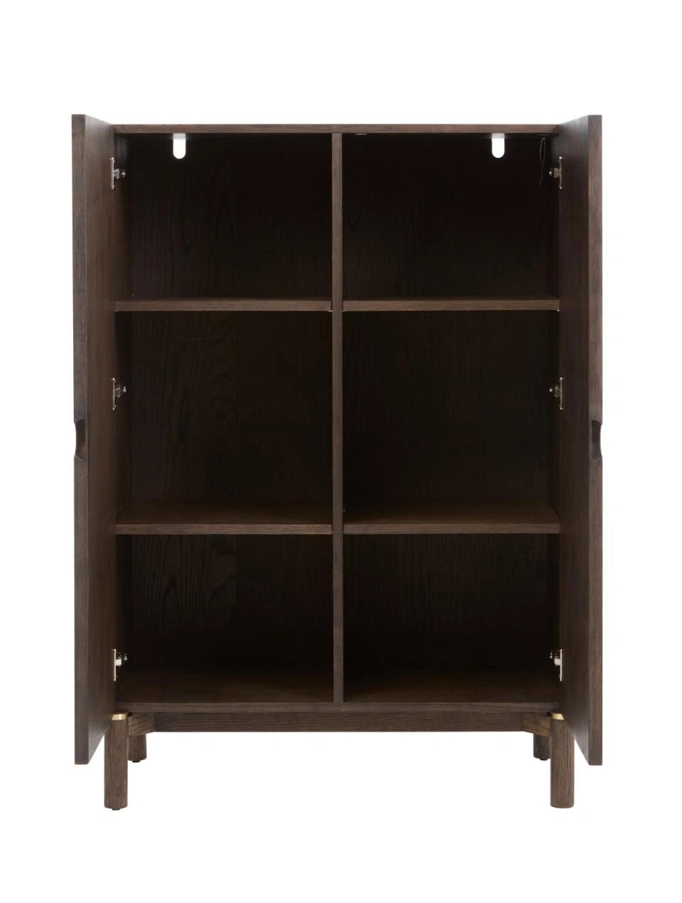Dwie zamykane szafki z czterema półkami pozwalają rozdzielić przechowywanie – osobno na tekstylia, dokumenty, naczynia czy dodatki do garderoby. Komoda doskonale sprawdzi się jako komoda do salonu, w roli pomocniczego mebla w jadalni lub jako komoda do sypialni na ubrania i pościel. Dzięki kompaktowej głębokości około 45,5 cm komoda Arun wygodnie zmieści się również w szerszym przedpokoju czy garderobie.