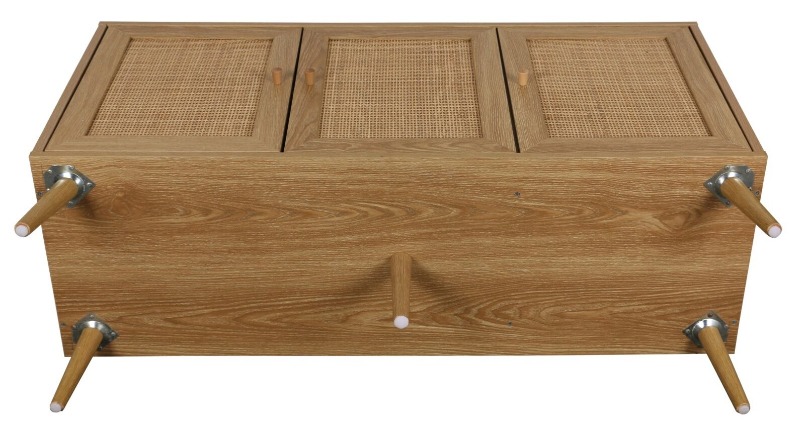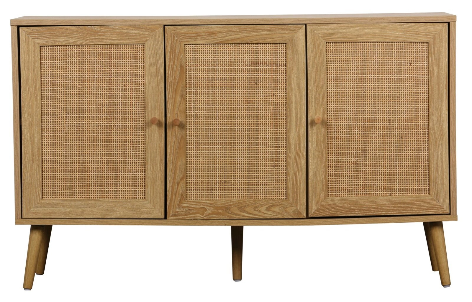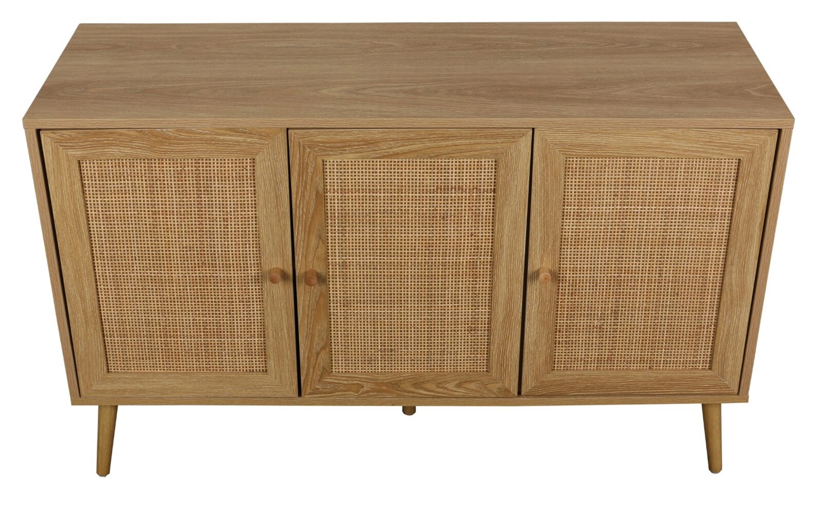 Jasny, ciepły odcień drewna sprawia, że komoda Ballo doskonale komponuje się z beżowymi i neutralnymi wnętrzami. Jej estetyka wprowadza do przestrzeni przytulność oraz lekkość, tworząc harmonijną atmosferę. Dodatkowo, rattanowe dekoracje frontów nadają meblowi oryginalności i podkreślają jego boho charakter.