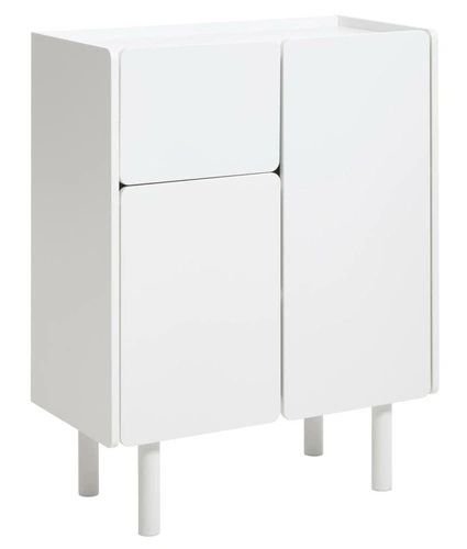 Komoda Bera marki UNIQUE to wysoka, nowoczesna komoda biała o szerokości 80 cm, zaprojektowana z myślą o przechowywaniu w salonie, sypialni czy przedpokoju. Wykonana z solidnej płyty meblowej w białym połysku, osadzona na smukłych nogach z drewna, oferuje funkcjonalne wnętrze z dwiema szafkami i półką, przy jednoczesnym zachowaniu lekkiej, eleganckiej formy.