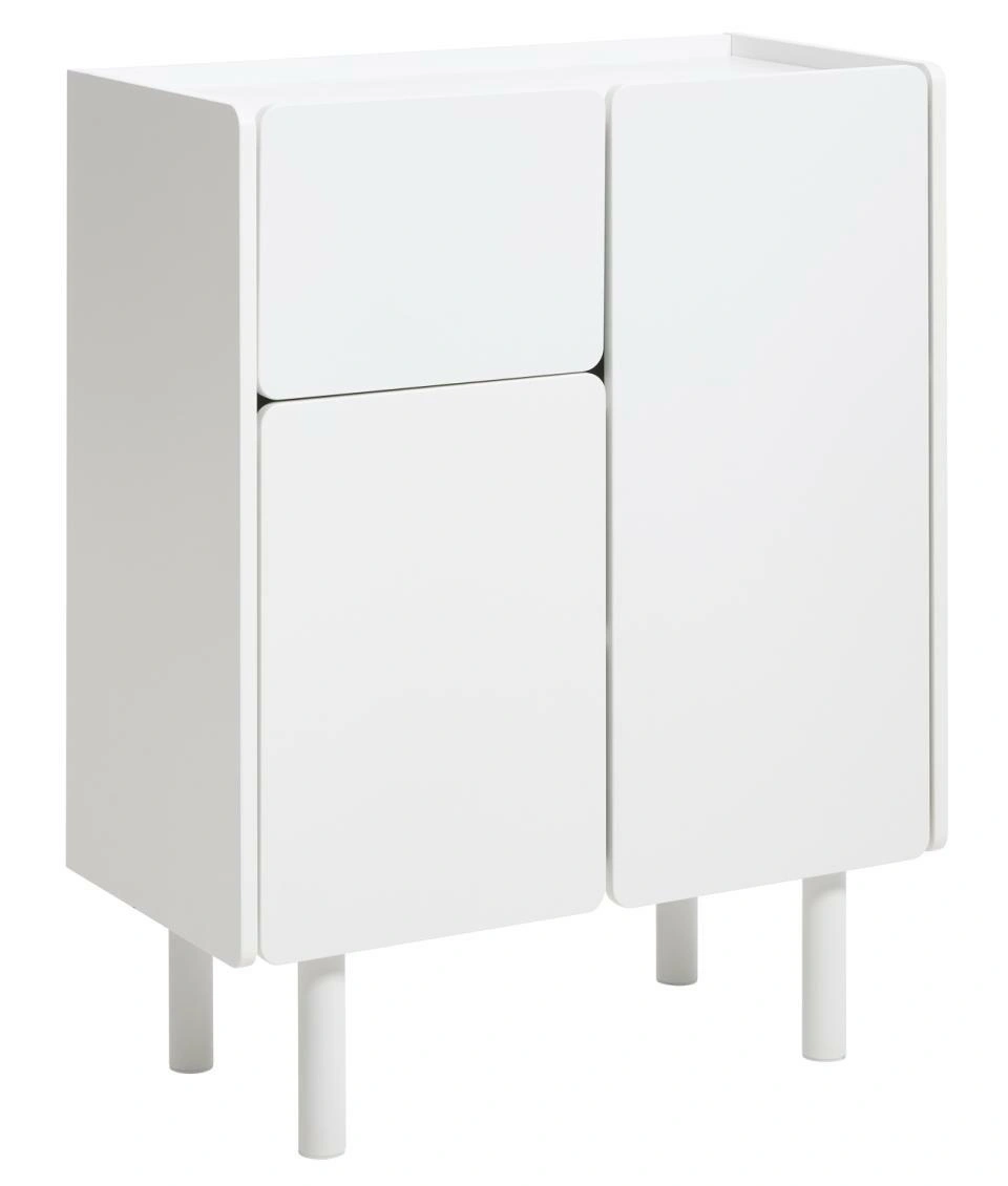 Jednym z największych atutów modelu Bera jest stabilna podstawa na czterech nogach z drewna, wykończonych w tym samym, białym kolorze. Taka konstrukcja dodaje bryle lekkości, dzięki czemu komoda nie przytłacza wnętrza, nawet gdy stoi na środku ściany. Wysokie nogi pozostawiają pod meblem wygodną przestrzeń na odkurzacz lub mop, co znacząco ułatwia utrzymanie podłogi w czystości.
