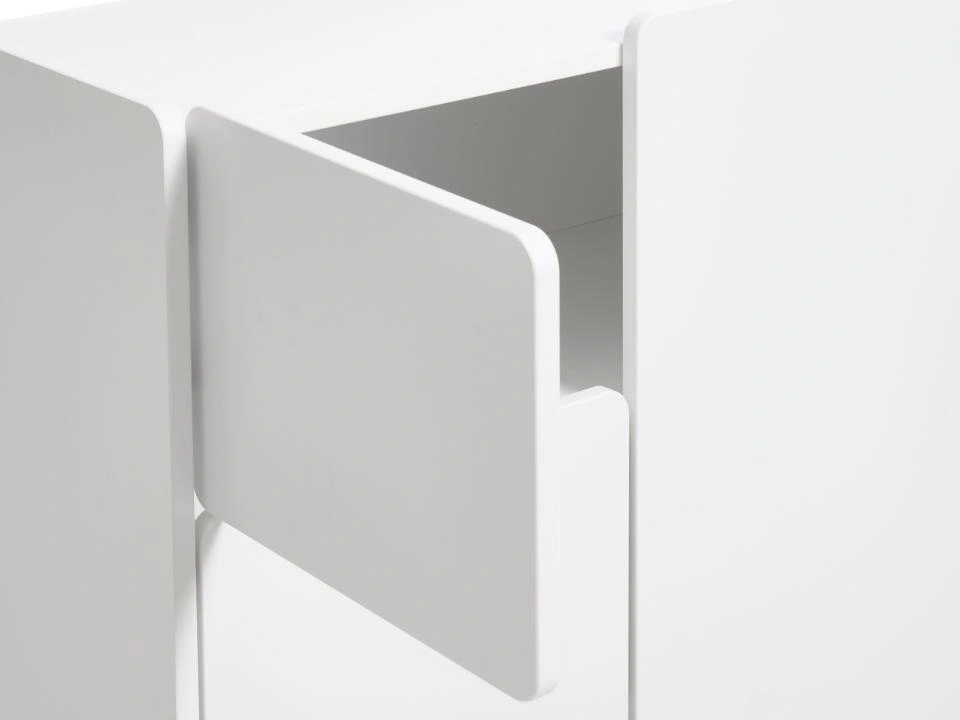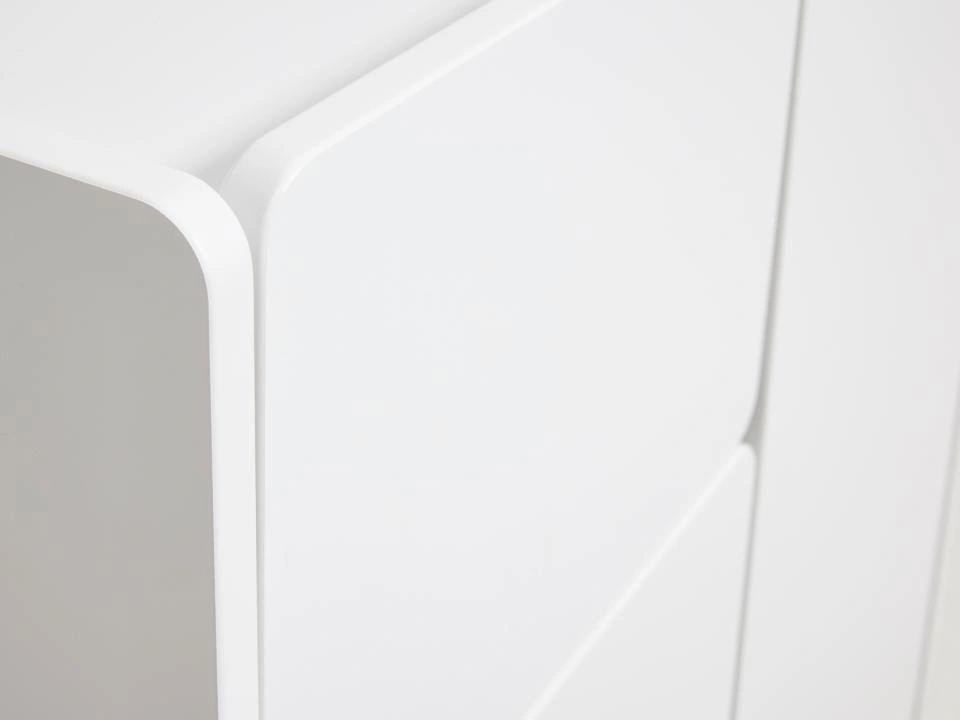 Biała komoda Bera łączy prostotę nowoczesnego wzornictwa z miękkimi, zaokrąglonymi liniami charakterystycznymi dla stylu japandi. Gładkie fronty bez zbędnych zdobień tworzą spokojną, harmonijną płaszczyznę, która nie przytłacza wnętrza, a dyskretnie je porządkuje. Biały połysk pięknie odbija światło, rozjaśniając pomieszczenie i optycznie je powiększając – szczególnie docenią to właściciele mniejszych salonów i sypialni.