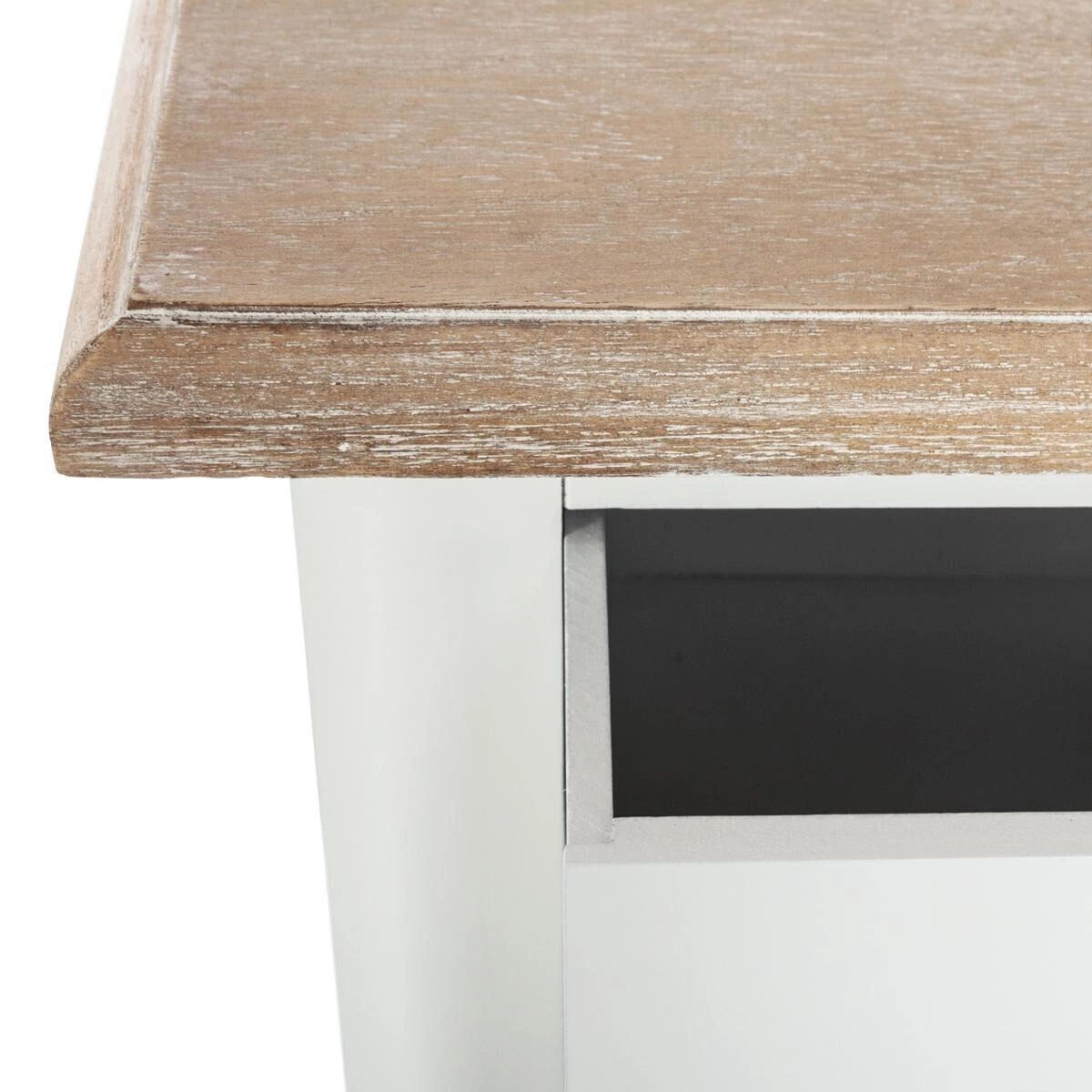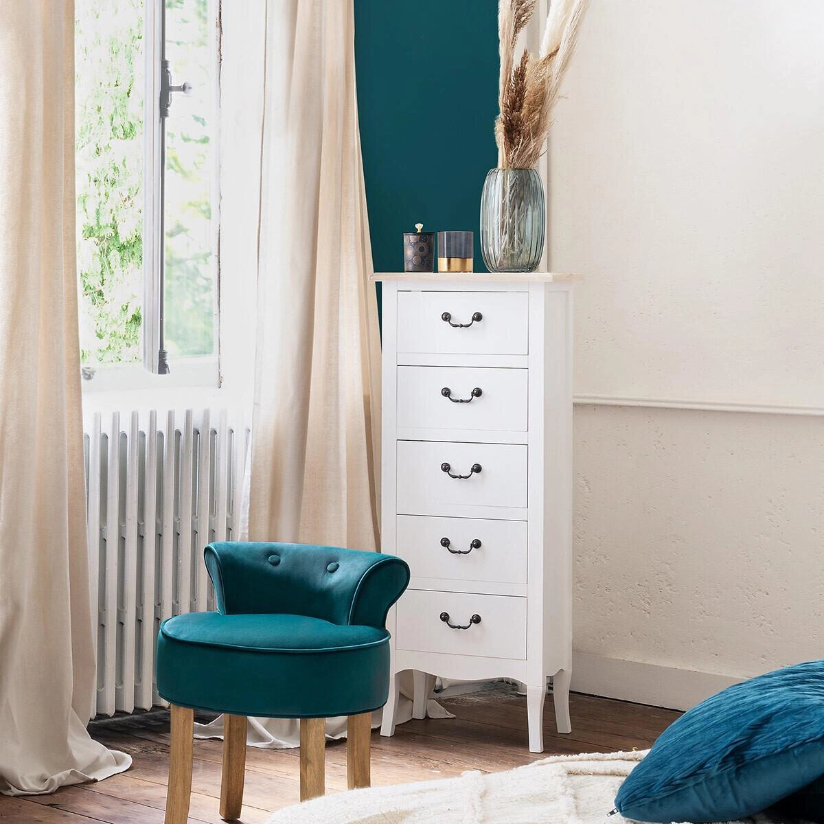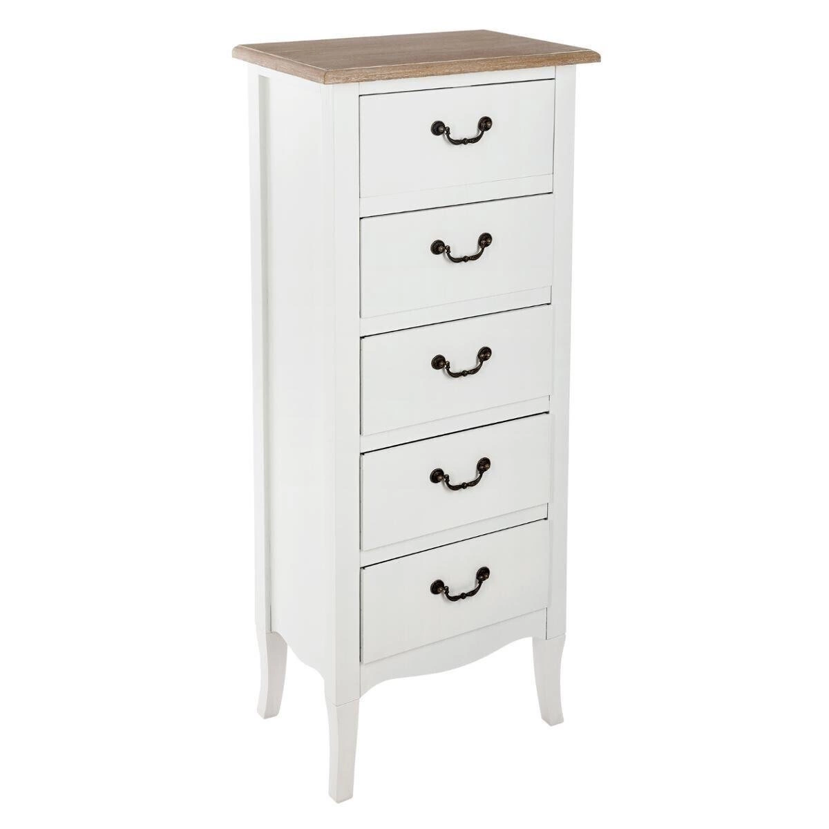 Wysoka komoda z 5 szufladami doskonale sprawdzi się w sypialni lub przedpokoju. Biała komoda z blatem w kolorze drewna to niezwykle pojemny mebel. Pięć szuflad o wymiarach wysokość: 15cm, szerokość: 32cm i głębokość: 24cm pomieści bieliznę, szaliki, czapki, kosmetyki lub inne podręczne przedmioty.