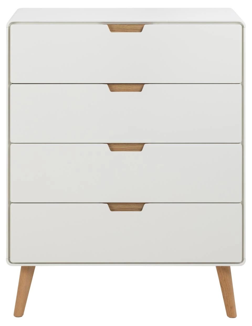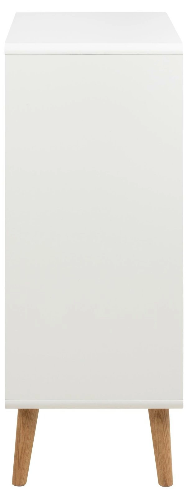 Komoda Lowell to mebel w stylu skandynawskim, który łączy w sobie prostotę i funkcjonalność. Biała kolorystyka i naturalne drewno dębowe dodają jej lekkości i świeżości. Stożkowe nogi, również wykonane z drewna dębowego, nadają komodzie stabilności i oryginalnego wyglądu.