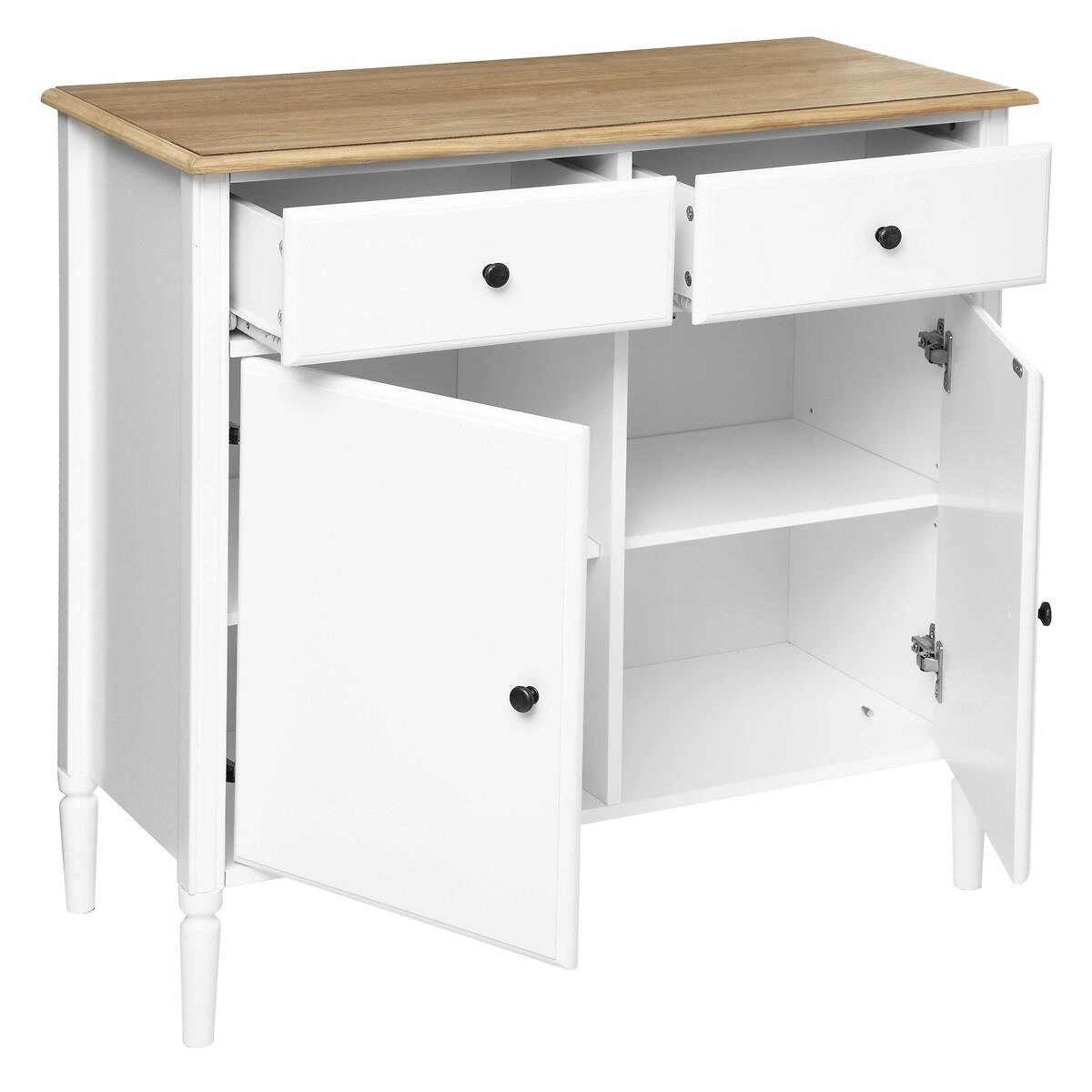 Wygląda szykownie i stylowo dzięki czystym liniom, białej lakierowanej powierzchni i kontrastującej górnej części w kolorze naturalnego drewna. Ale ten wspaniały mebel oferuje coś więcej niż tylko dobry wygląd: zapewnia dużo miejsca do przechowywania dzięki dwóm przestronnym szafkom i dwóm dużym szufladom. Ponadto, dzięki czterem stosunkowo wysokim nogom, komoda Solen wydaje się niemalże nieważka, dzięki czemu sprzątanie pod nią jest bardzo proste!