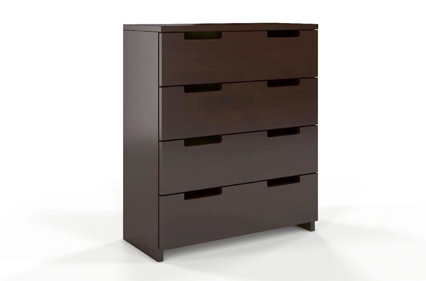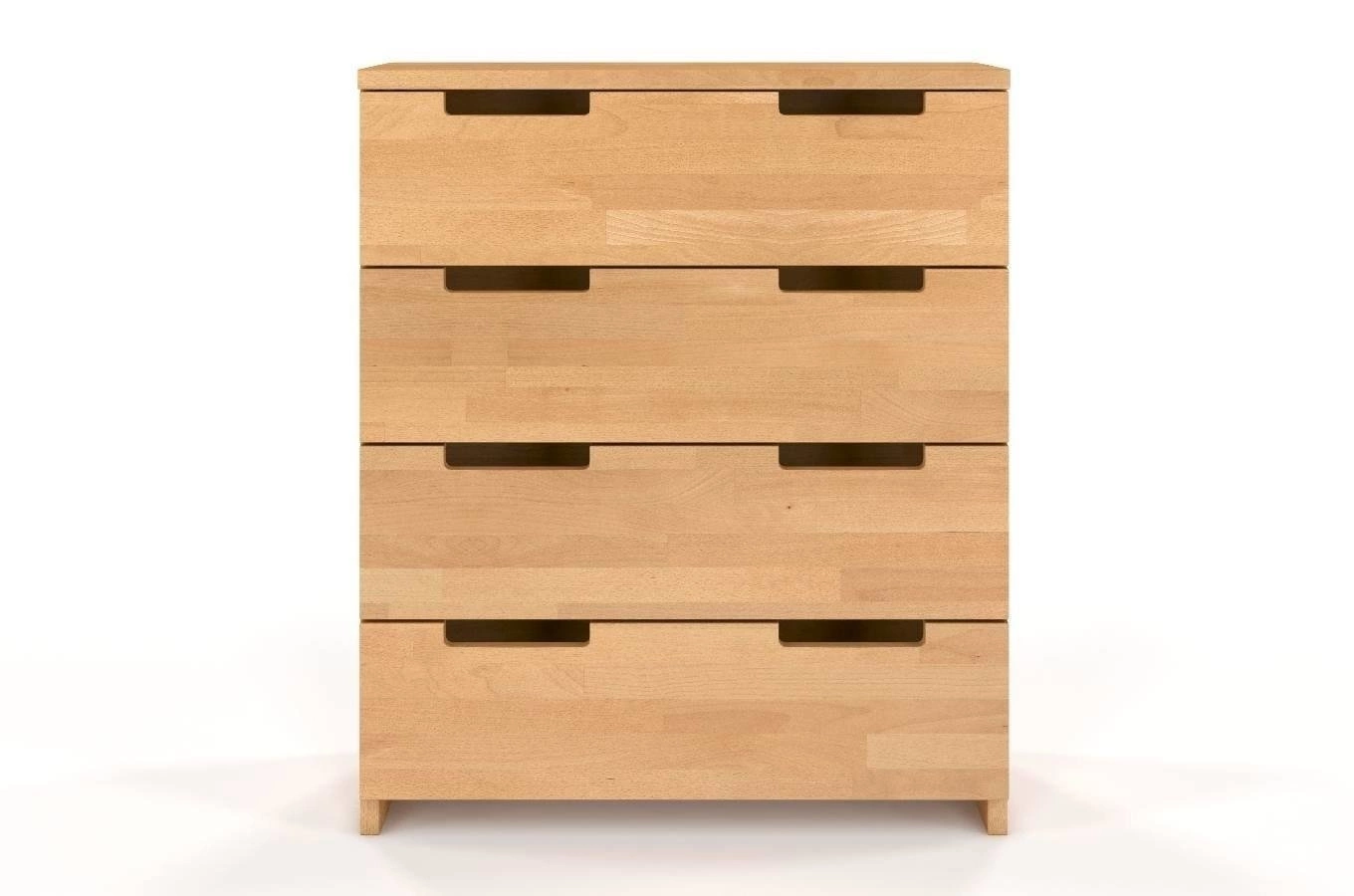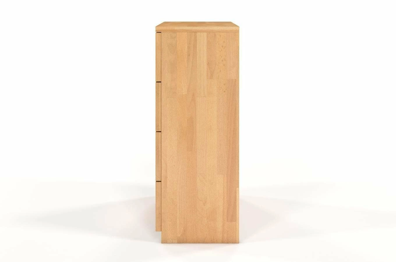 To średniej wielkości komoda w minimalistycznym stylu nawiązującym do skandynawskiego wzornictwa. Wykonana z wysokiej jakości drewna bukowego polskiego pochodzenia, które dzięki specjalnej technologii łączenia na "mikrowczepy" jest się meblem ponadprzeciętnej wytrzymałości. O wysokiej jakości tej komody decydują także detale - prowadnice z systemem cichego domyku i hamulcem, dzięki którym szuflady zamykają się bezgłośnie i miękko.
