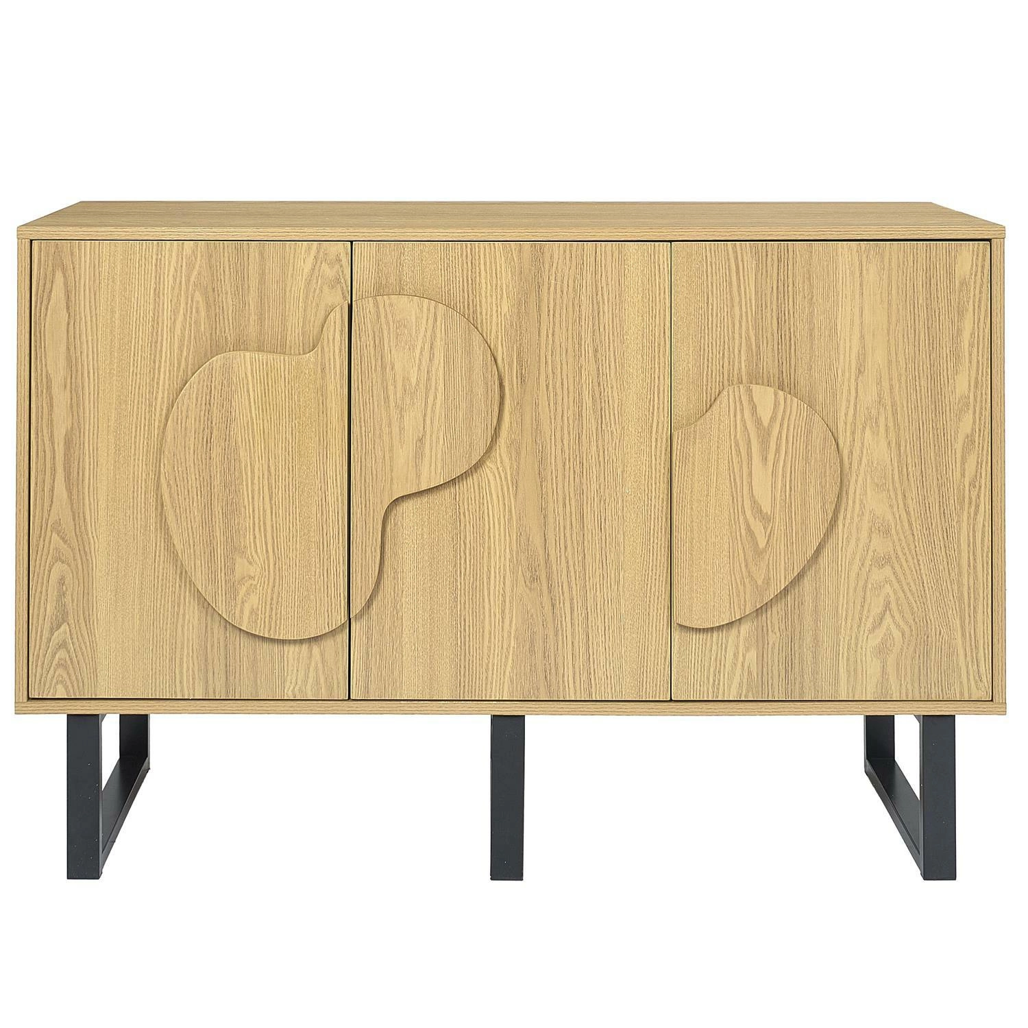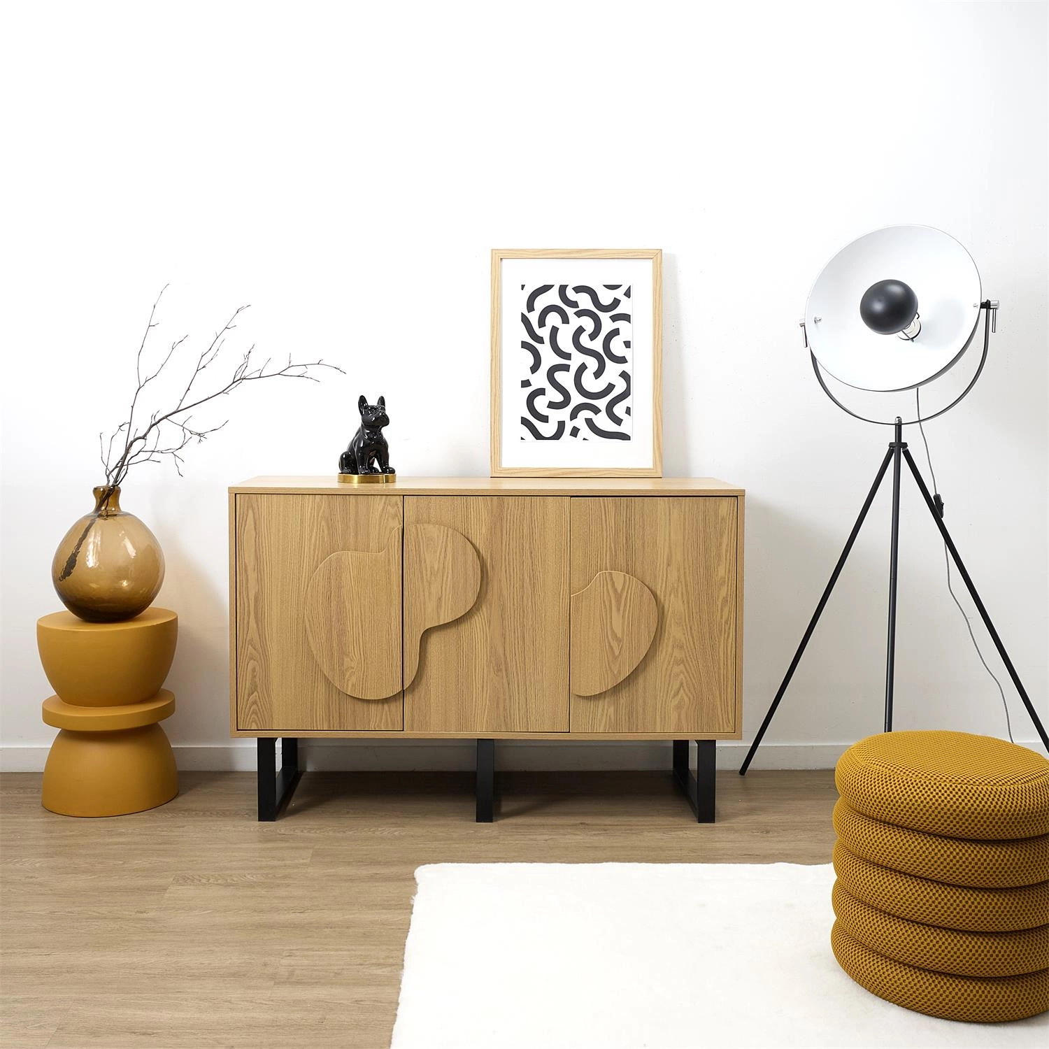 Komoda Calypso stworzona została z myślą o miłośnikach oryginalnych aranżacji, którzy cenią ciepłe materiały i inspiracje naturą. Zdobione fronty przykuwają wzrok i nadają meblowi indywidualny charakter, a wykończenie w półmacie podkreśla unikalną strukturę dębu artisan. Czarna, metalowa podstawa w formie płóz nadaje komodzie lekkości, a jednocześnie zapewnia solidność konstrukcji. Taki design doskonale współgra z wnętrzami w stylu boho, orientalnym czy japandi.