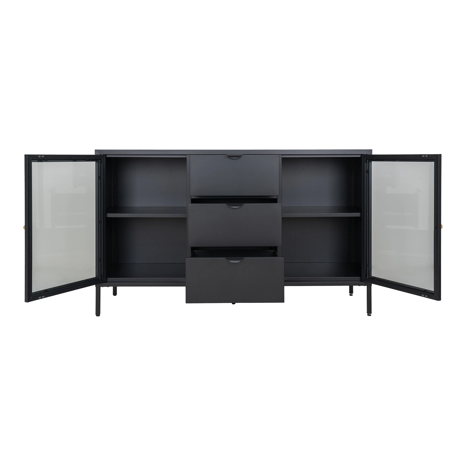 - Posiada 3 szuflady i 2 drzwi ze szklanymi frontami, co zapewnia dużo miejsca do przechowywania.