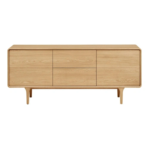 Komoda Darwin marki House Nordic to pojemna komoda drewniana o szerokości 180 cm, wykończona w kolorze naturalnego dębu, z dekoracyjnymi ryflowanymi frontami oraz wysokimi nóżkami. Łączy funkcję eleganckiej komody do salonu, sypialni lub przedpokoju z praktycznym miejscem do przechowywania dzięki dwóm szafkom i dwóm szufladom.