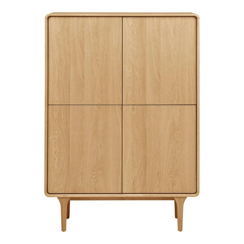 Komoda Darwin marki House Nordic to wysoka, skandynawska komoda drewniana o szerokości 100 cm, wykończona w kolorze naturalnego dębu. Cztery zamykane szafki, gładkie fronty i smukłe nogi tworzą funkcjonalny mebel, który sprawdzi się w salonie, sypialni, przedpokoju czy pokoju młodzieżowym.