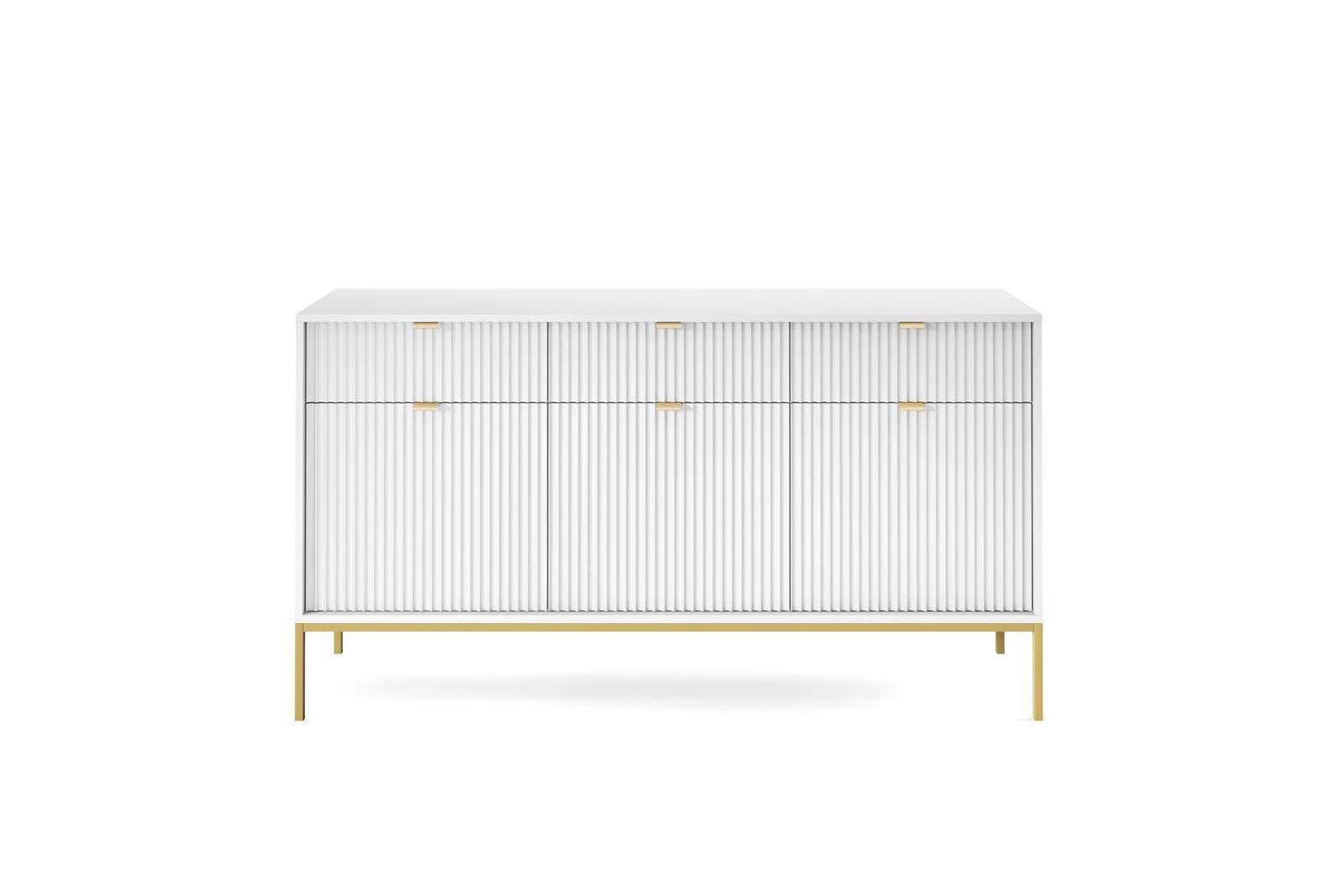 Oszałamiająca komoda z ryflowanymi frontami i stylowymi złotymi uchwytami wniesie wyrafinowanie i urok do każdej przestrzeni. Jej trzy szuflady i trzy szafki oferują dużą pojemność do przechowywania wszystkich rzeczy - od odzieży i biżuterii po sztućce, pamiątki i elektronikę. Co więcej, metalowe nóżki zapewniają długotrwałą stabilność, a także dodatkową wysokość, dzięki czemu można bez wysiłku sięgać w dół lub sprzątać pod nim bez trudności.