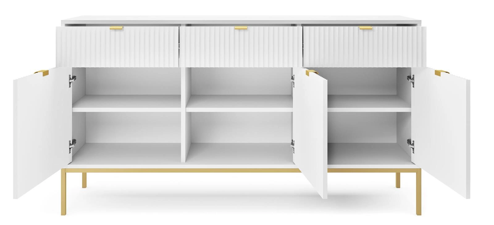 Oszałamiająca komoda z ryflowanymi frontami i stylowymi złotymi uchwytami wniesie wyrafinowanie i urok do każdej przestrzeni. Jej trzy szuflady i trzy szafki oferują dużą pojemność do przechowywania wszystkich rzeczy - od odzieży i biżuterii po sztućce, pamiątki i elektronikę. Co więcej, metalowe nóżki zapewniają długotrwałą stabilność, a także dodatkową wysokość, dzięki czemu można bez wysiłku sięgać w dół lub sprzątać pod nim bez trudności.