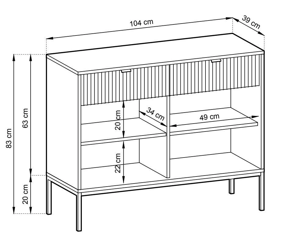 Idealnie zaprojektowane wymiary sprawiają, że komoda jest niebywale ergonomiczna oraz pojemna. Wymiary: szerokość 104 cm, wysokość 83 cm i głębokość 39 cm sprawią, że komoda na pewno odpowie na Twoje potrzeby. Komoda jest wyposażona w dwie szuflady oraz dwie pojemne szafki, w których bez żadnego problemu schowasz zarówno większe rzeczy, jak i wszystkie niezbędne drobiazgi. Komoda jest również wyposażona w cztery półki, na których położysz drobiazgi, po które sięgasz najczęściej. Nawet po brzegi wypełniona komoda stoi stabilnie, ponieważ całość mebla jest oparta na czterech nogach. Podstawą komody są wysokie nogi, co ułatwia wjechanie pod mebel robotom sprzątającym, a także sprzątanie z pomocą tradycjyjnego odkurzacza oraz mopowanie podłogi. Komoda jest na tyle uniwersalna i przyjazna w obsłudze, że znakomicie będzie pasować nie tylko do przedpokoju, ale także do salonu, jadalni i sypialni. Komoda jest pojemna, ale jednocześnie posiada dość standardowe i kompaktowe wymiary, dzięki czemu bez żadnych przeszkód możesz wstawić ją do wnętrz o najróżniejszych wielkościach. Komoda, wzbogacona dopasowanymi do wnętrza dekoracjami, okaże się podstawą i najważniejszym punktem wystroju, ale może też być umiejętnie dopasowana do sprzętów, które posiadasz już w swoim mieszkaniu.