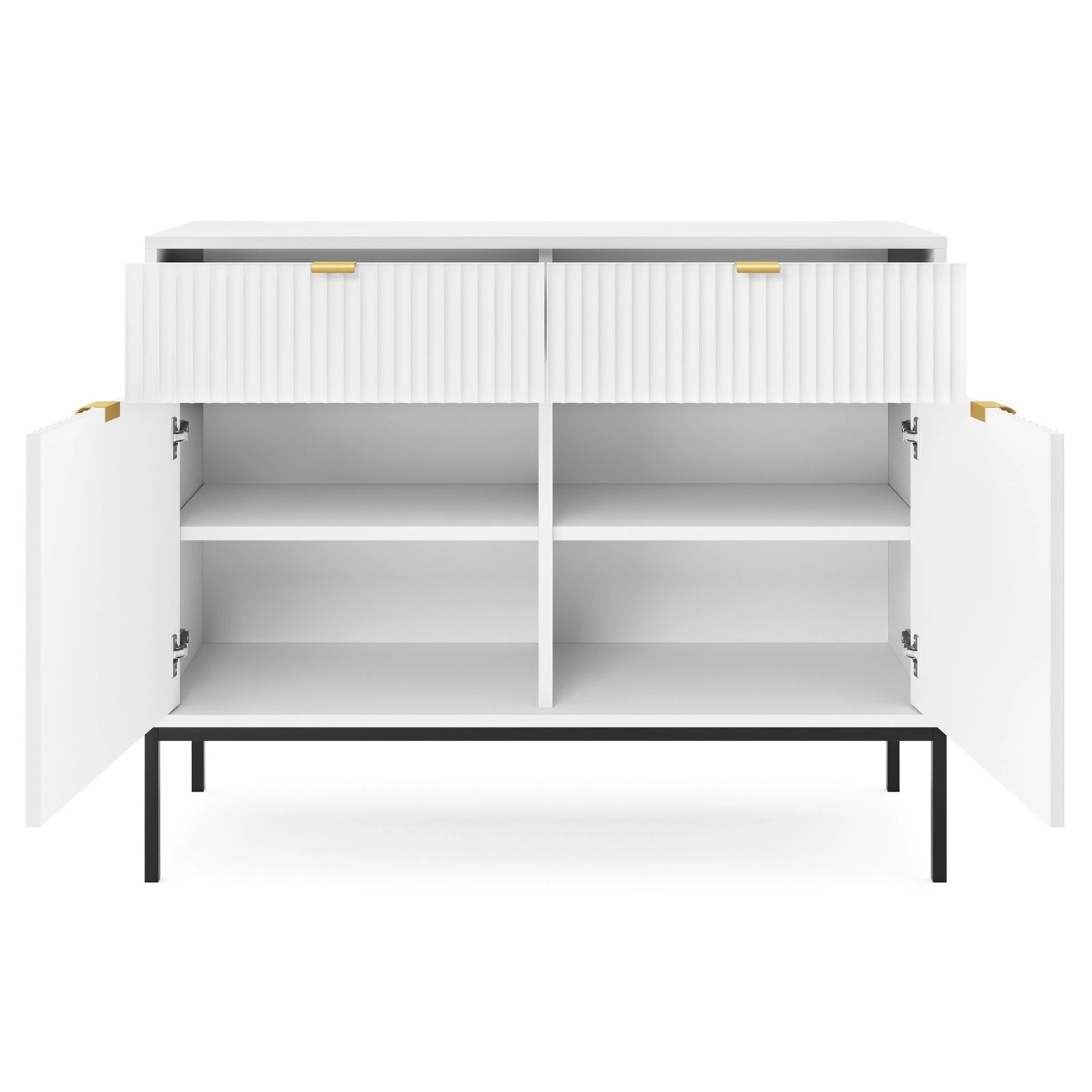 Komoda Delicious ryflowana biała marki Intesi to fantastyczny mebel do organizacji różnej wielkości przedmiotów. Komodę o białej i czarnej barwie zrobiono z aluminium, meblowej płyty i metalu, dzięki czemu jest nie tylko oryginalna, ale też solidna. Dzięki temu, że komodę stworzono z z metalu, meblowej płyty i aluminium, jest ona uniwersalna, solidna i optycznie podkreśla styl pomieszczenia, ale liczymy na to, że samodzielnie przekonasz się też o innych plusach tych surowców. Klasycznego i minimalistycznego wyglądu całości komody nie burzy delikatny ozdobnik, jakim są metalowe uchwyty.