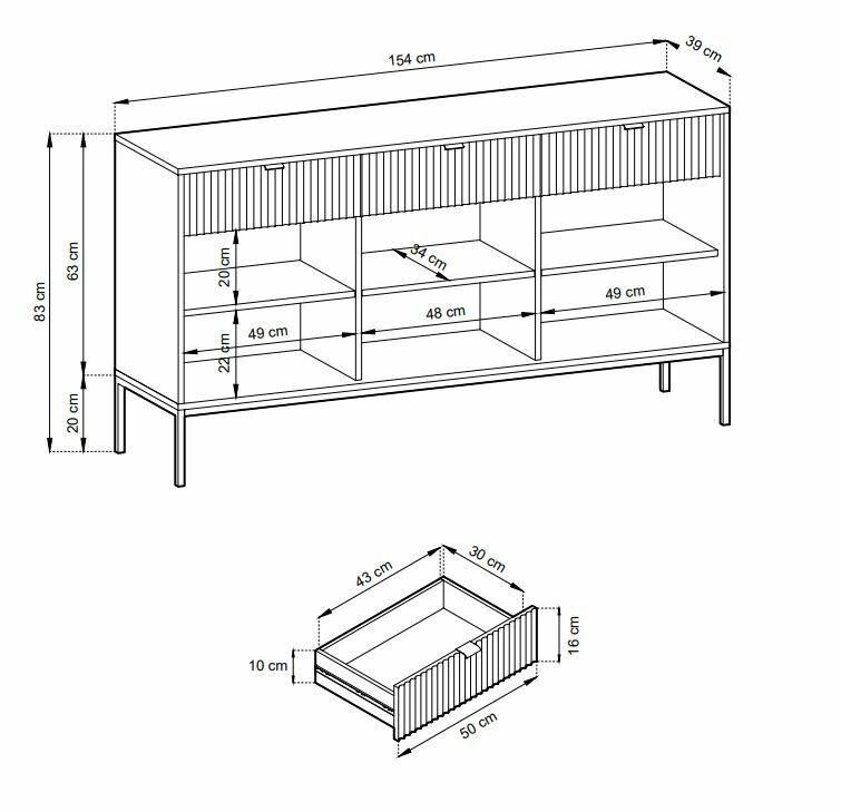 - Komoda jest pojemna - jej szerokość to 154 cm, a wysokość 83 cm. Dzięki temu pomieści wiele przedmiotów, nie zajmując jednocześnie zbyt wiele miejsca.