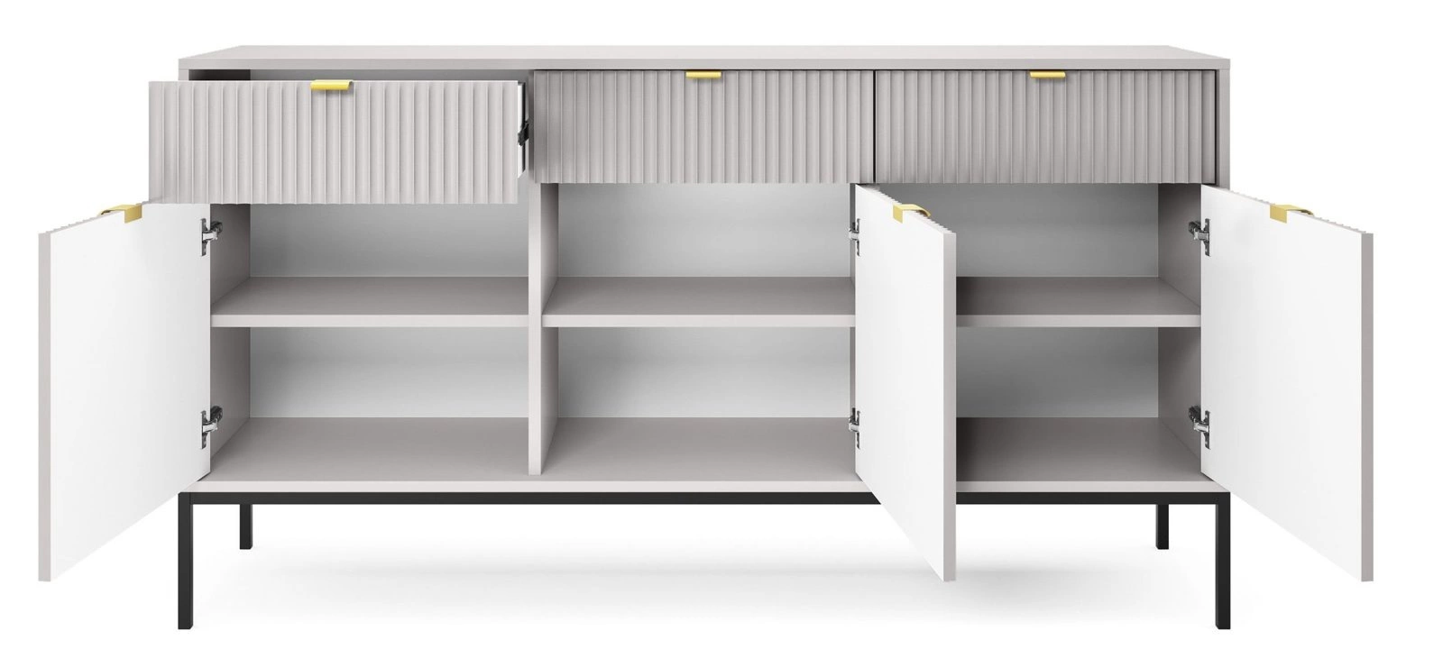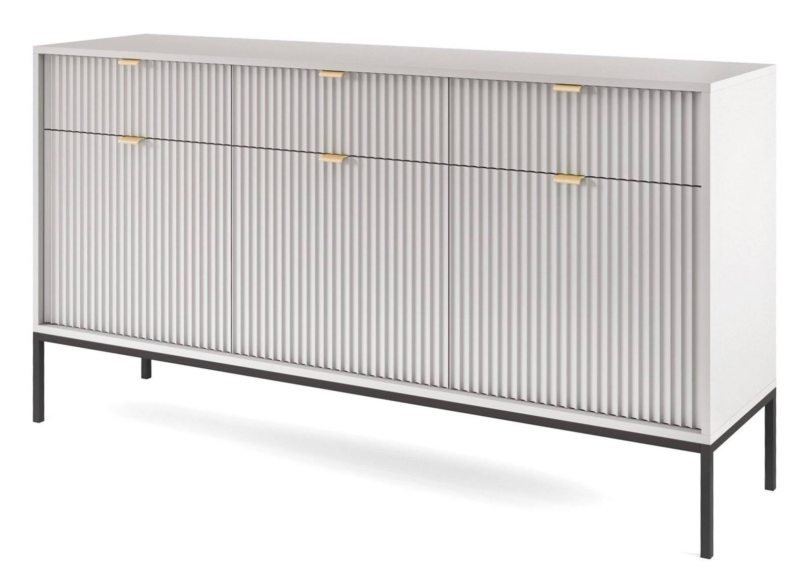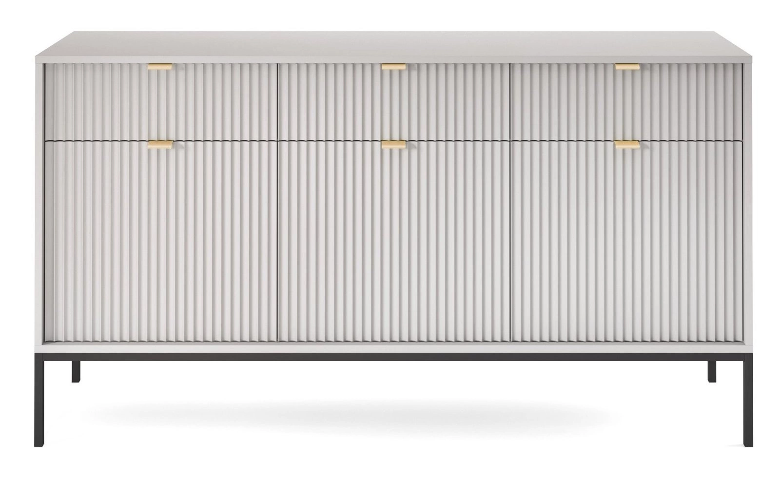 Komoda Delicious duża ryflowana szara marki Intesi to doskonały mebel do organizacji odzieży i nie tylko. Trwała i pojemna komoda w szarym i czarnym kolorze jest wykonana z meblowej płyty, metalu i aluminium. Metal, meblowa płyta i aluminium sprawiają, że komody stworzone z tych materiałów są klasyczne, solidne i optycznie podkreślają styl pomieszczenia. To jednak nie wszystkie mocne strony tych surowców. Delikatnym zdobieniem, które nie burzy zachowawczej i nowoczesnej stylistyki całości, są metalowe uchwyty.