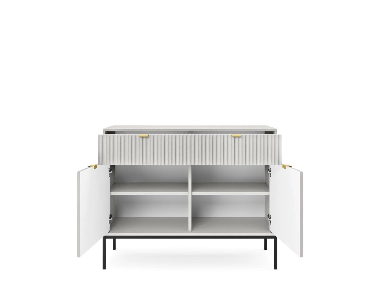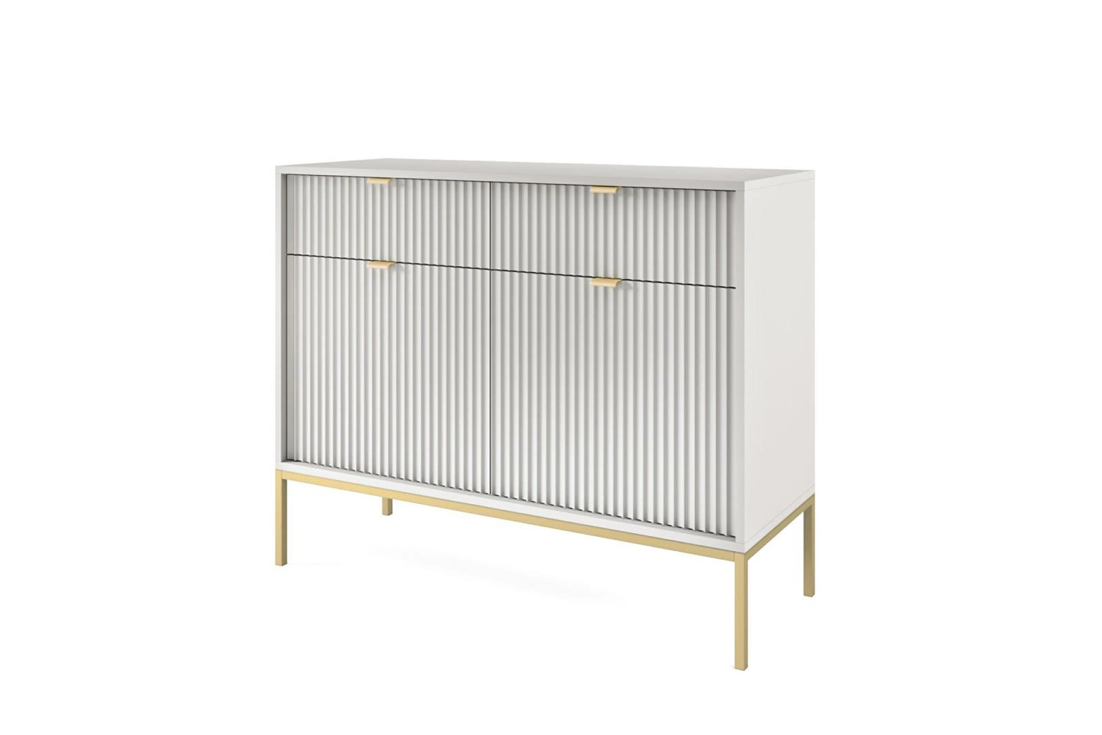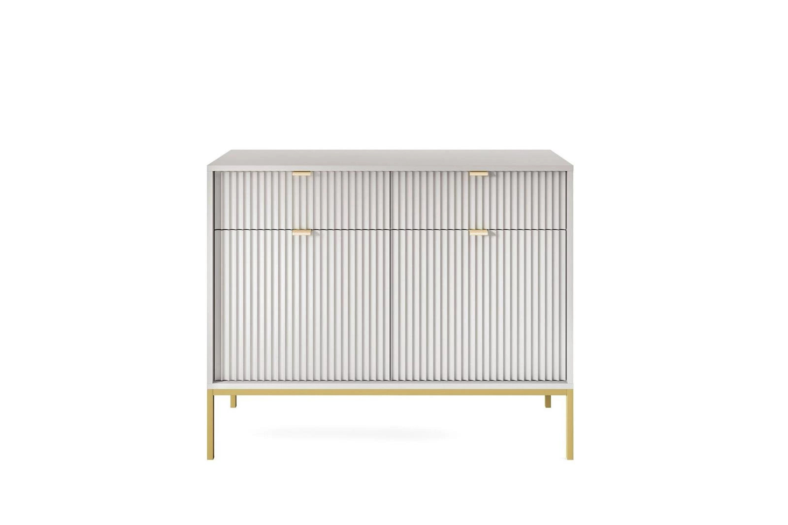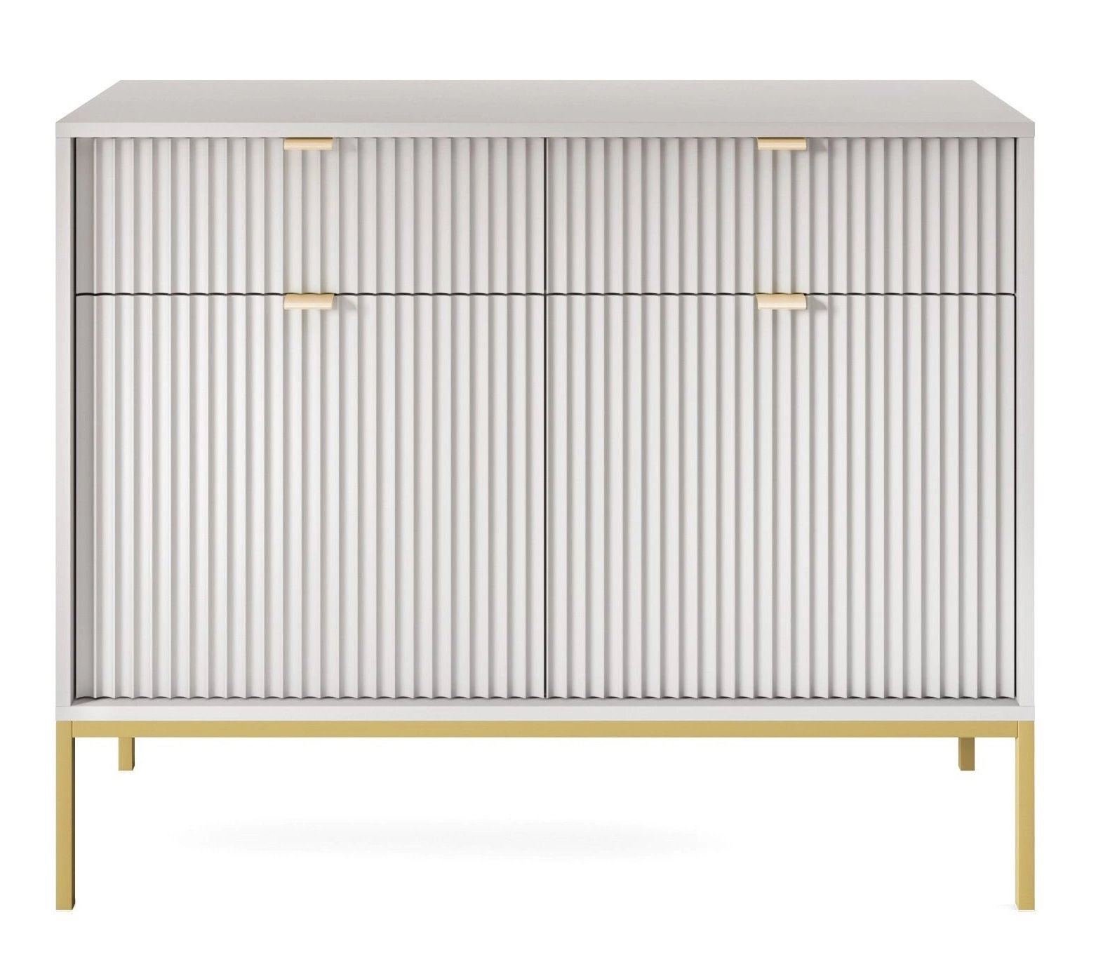 Oszałamiająca komoda z ryflowanymi frontami i stylowymi złotymi uchwytami wniesie wyrafinowanie i urok do każdej przestrzeni. Jej dwie szuflady i dwie szafki oferują dużą pojemność do przechowywania wszystkich rzeczy - od odzieży i biżuterii po sztućce, pamiątki i elektronikę. Co więcej, metalowe nóżki zapewniają długotrwałą stabilność, a także dodatkową wysokość, dzięki czemu można bez wysiłku sięgać w dół lub sprzątać pod nim bez trudności.