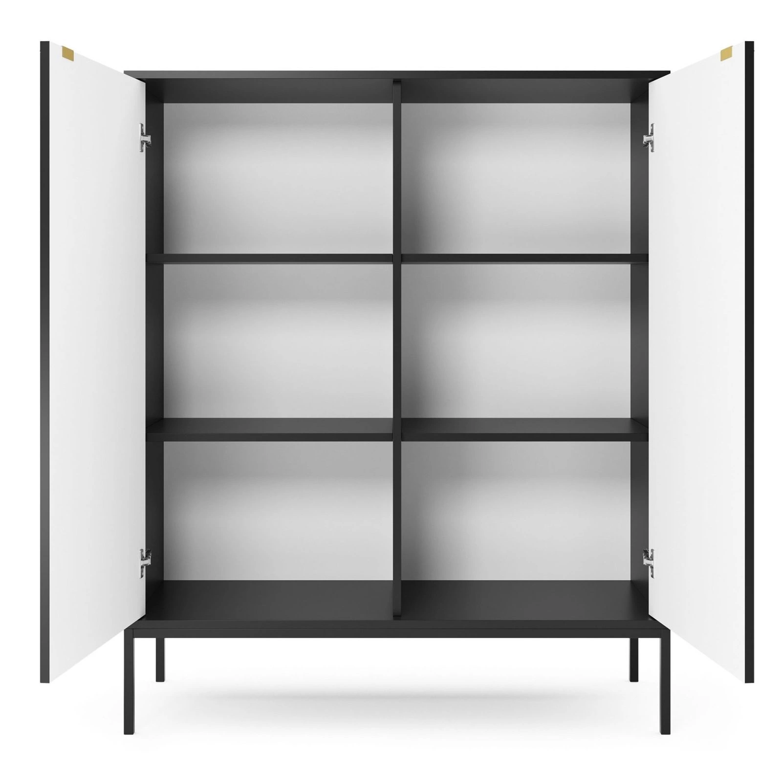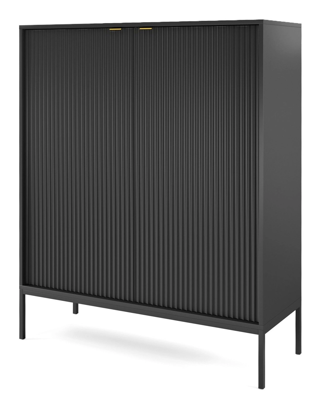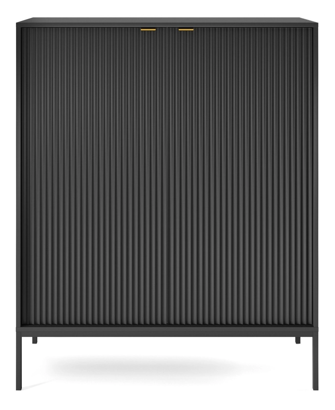 Komoda Delicious wysoka czarna ryflowana na nóżkach 104 cm marki Intesi to propozycja dla miłośników nowoczesnych i industrialnych wnętrz. Wyróżnia się matowym wykończeniem, pionowo frezowanymi frontami oraz praktycznym układem – 2 szafki, 6 półek i solidna metalowa podstawa na czterech wysokich nogach. Dzięki szerokości 104 cm i wysokości 125 cm, ta komoda świetnie sprawdzi się zarówno w salonie, sypialni, jak i przedpokoju, oferując przestrzeń do przechowywania i stylowy akcent aranżacyjny.