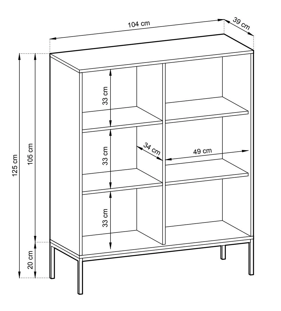 Komoda Delicious została zaprojektowana z myślą o maksymalnej wygodzie użytkowania. Sześć pojemnych półek i dwie zamykane szafki pomieszczą zarówno ubrania, dokumenty, jak i dekoracje czy domowe drobiazgi. Wysokość 125 cm pozwala wygodnie ustawić na blacie lampę, książki lub rośliny, a szerokość 104 cm sprawia, że komoda zmieści się nawet w węższych wnętrzach, oferując optymalną ilość miejsca do przechowywania.
