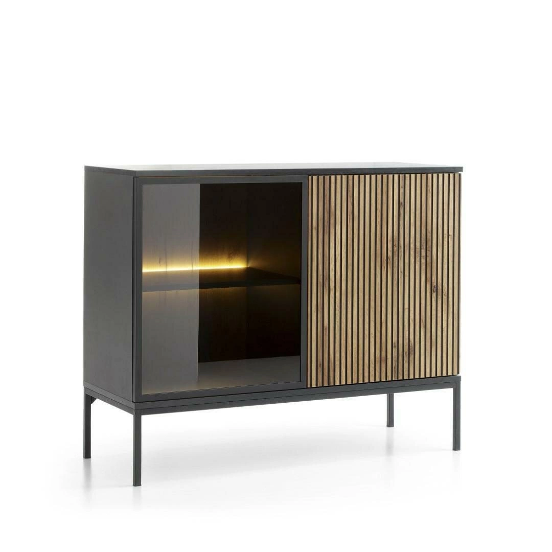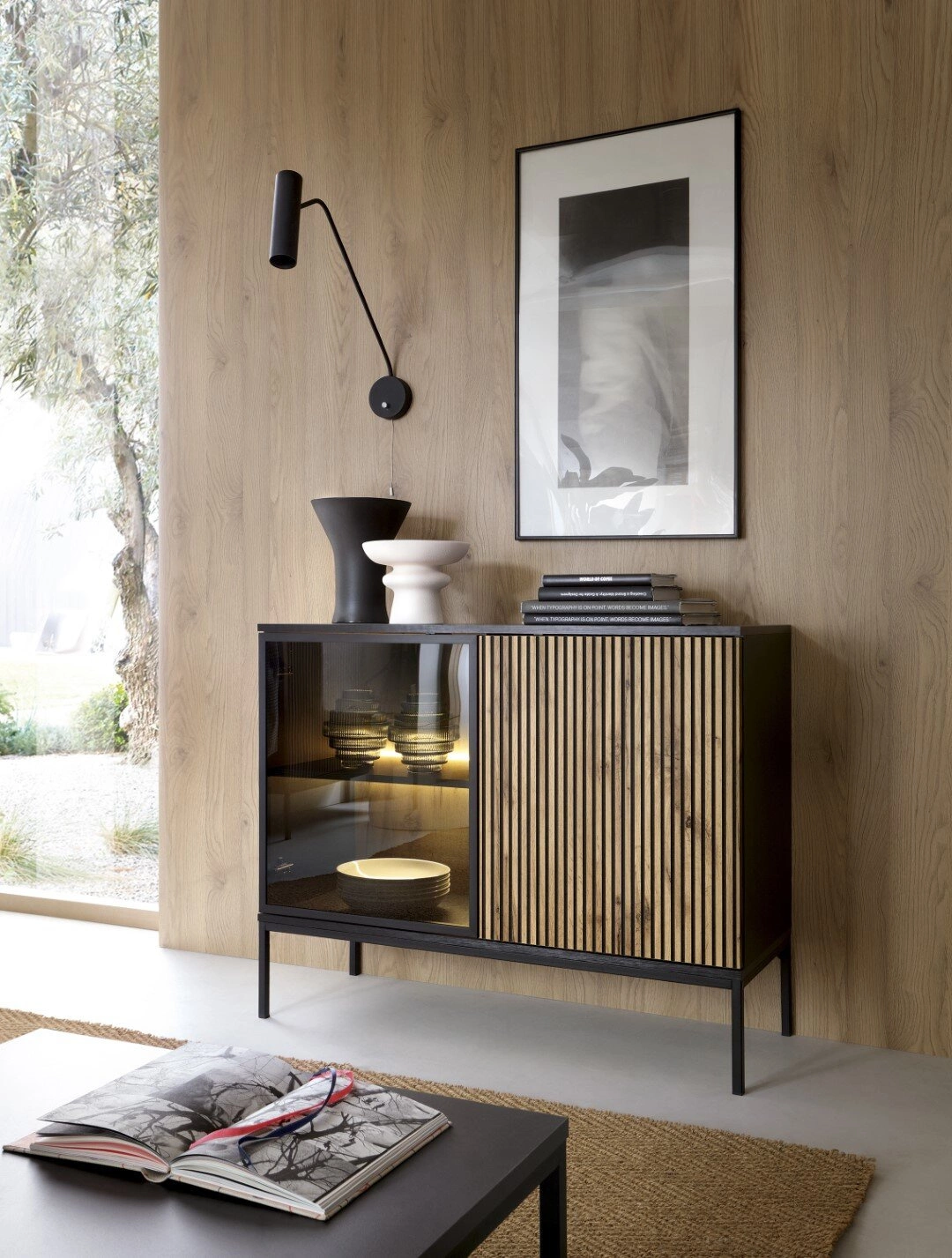 Komoda do salonu Novel marki Intesi to industrialny mebel o szerokości 104 cm, łączący ponadczasowy czarny kolor z wyrazistym dekorem dąb wotan. Wyróżnia ją frezowany, pionowy front, nowoczesne oświetlenie LED oraz cztery smukłe, metalowe nóżki. Przemyślana konstrukcja gwarantuje wygodne przechowywanie w salonie, sypialni czy przedpokoju, a system push to open zapewnia intuicyjną obsługę.