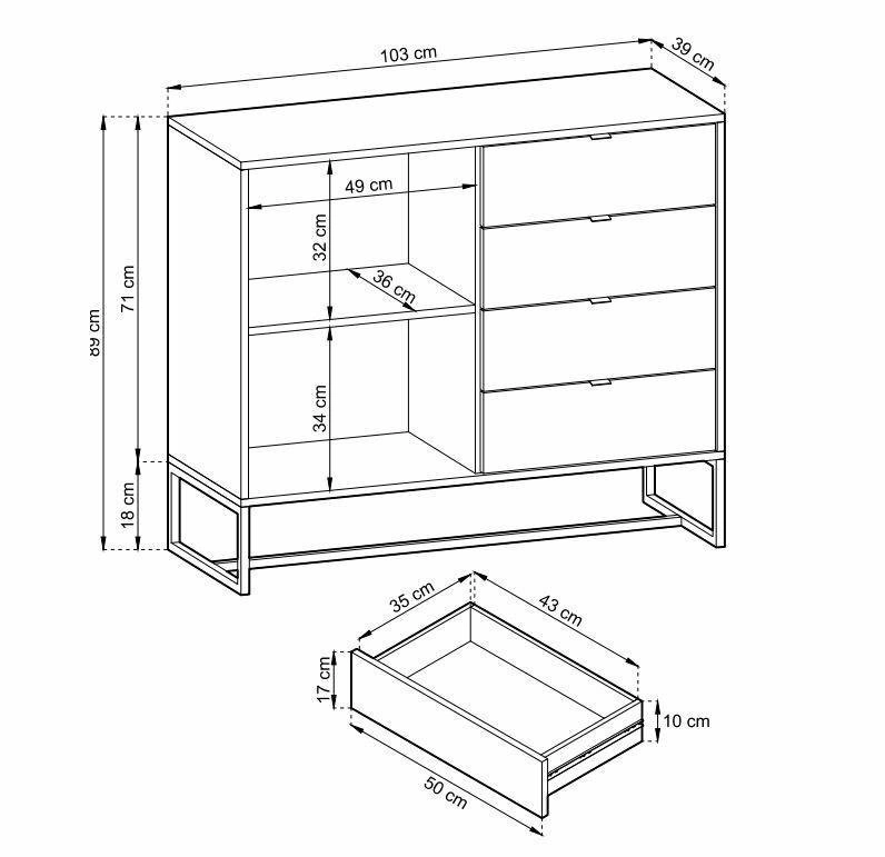 Komoda Dori to nowoczesny mebel inspirowany klimatem industrialnym. Wykonana została z lekkiej, trwałej płyty MDF w okleinie dębu. Komoda składa się z czterech szuflad i szafek, które pozwalają na przechowywanie ubrań, bielizny czy dokumentów. Zastosowane kontrastowe kolory - odcienie dębu oraz czarny metal - dodają jej efektowności i sprawiają, że komoda prezentuje się bardzo stylowo. Nowoczesne nogi komody tworzą subtelną konstrukcję, która sprawdzi się w każdym wnętrzu.