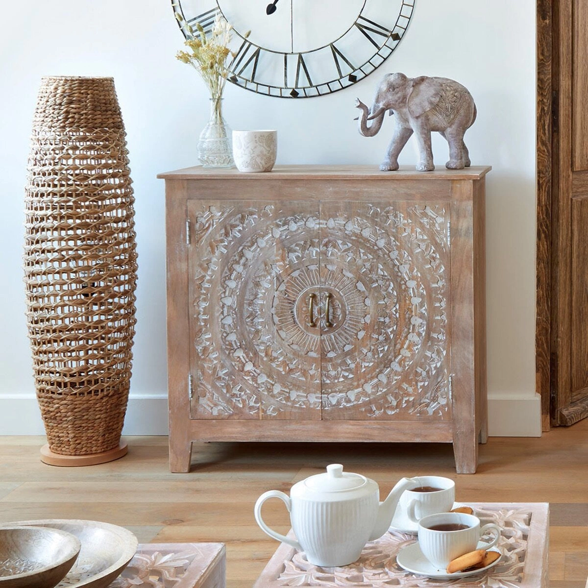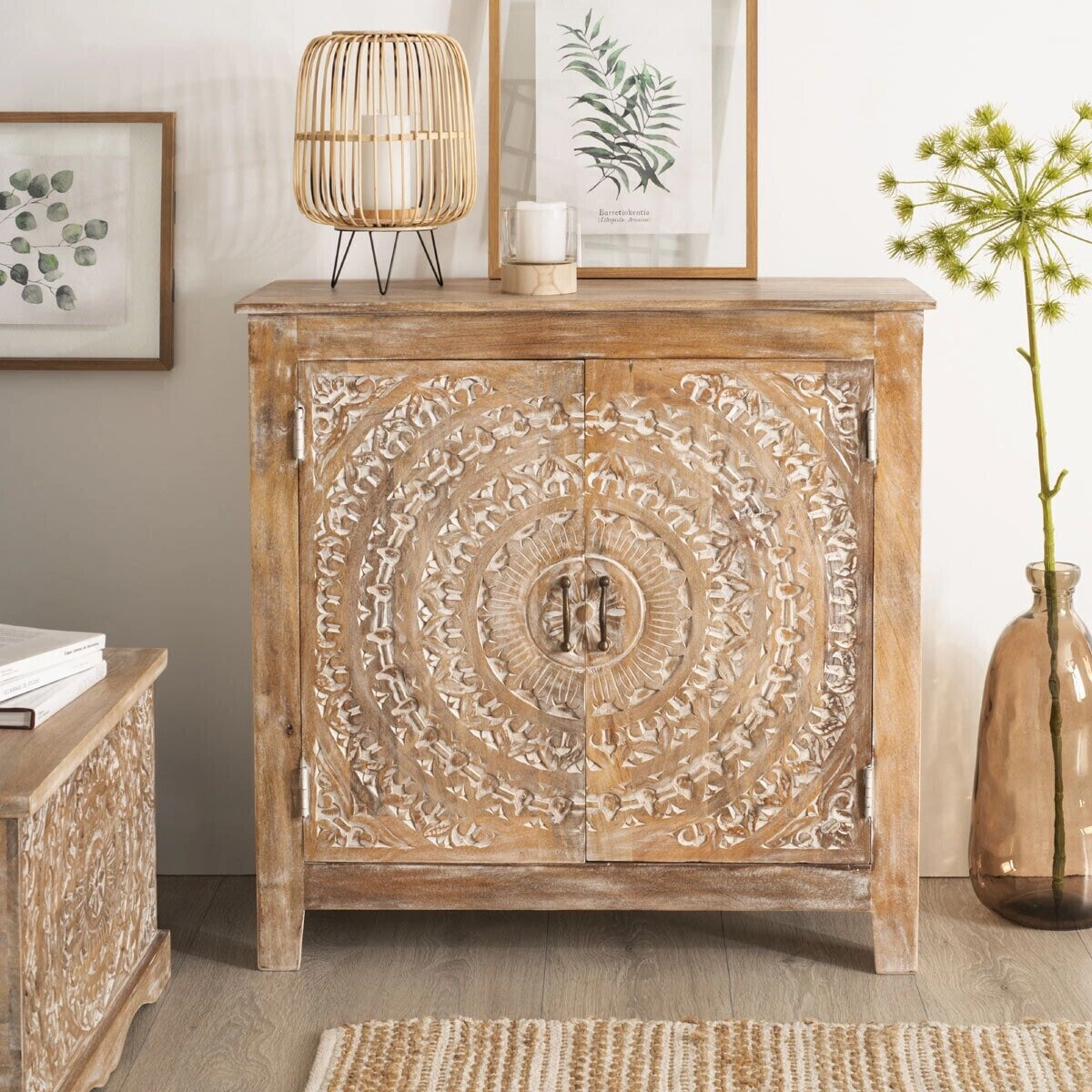 Komoda Shirel mango to mebel, który przeniesie Cię w egzotyczne miejsca bez wychodzenia z domu. Ręcznie rzeźbione drzwi przypominają mandale, które są symbolem harmonii i spokoju. Komoda świetnie komponuje się z naturalnymi materiałami, takimi jak bawełna, juta czy rattan. Można ją postawić obok lampy bambusowej Atmosphera, co podkreśli detale na drzwiach.