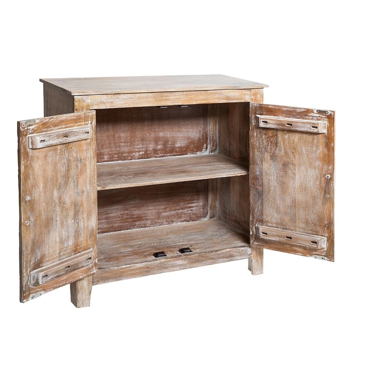 Atmosphera stworzyła komodę, która łączy w sobie funkcjonalność i niepowtarzalny wygląd. Dwa duże regały wewnątrz komody pomieszczą wiele przedmiotów, od dokumentów po dekoracje. Komoda jest łatwa do czyszczenia – wystarczy przetrzeć ją suchą szmatką. Aby zachować jej piękno na długie lata, zaleca się nałożenie na nią przezroczystego oleju ochronnego.