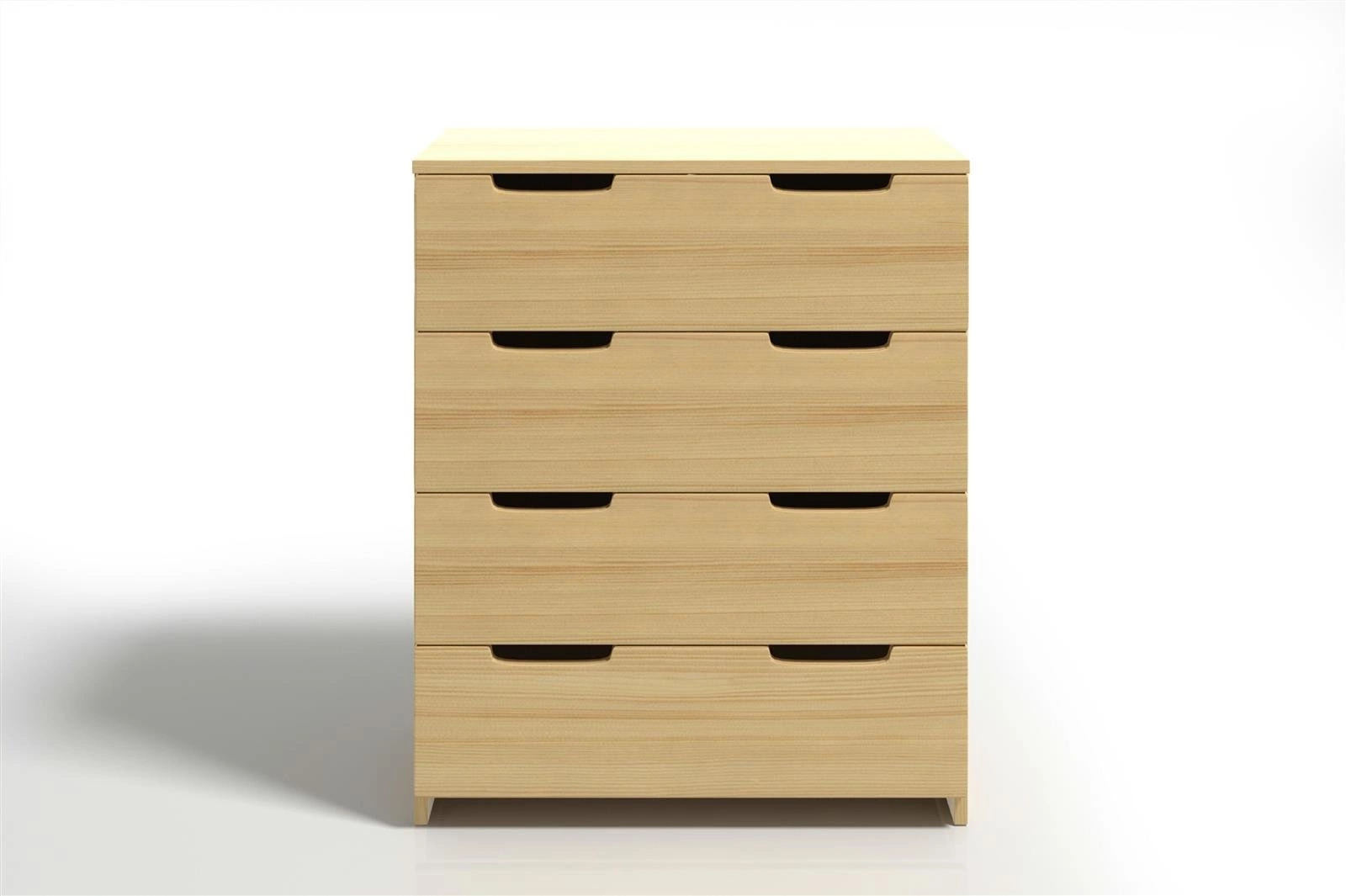 To średniej wielkości komoda w minimalistycznym stylu nawiązującym do skandynawskiego wzornictwa. Wykonana z wysokiej jakości drewna sosnowego polskiego pochodzenia, które dzięki specjalnej technologii łączenia na "mikrowczepy" jest się meblem ponadprzeciętnej wytrzymałości. O wysokiej jakości tej komody decydują także detale - prowadnice z systemem cichego domyku i hamulcem, dzięki którym szuflady zamykają się bezgłośnie i miękko.