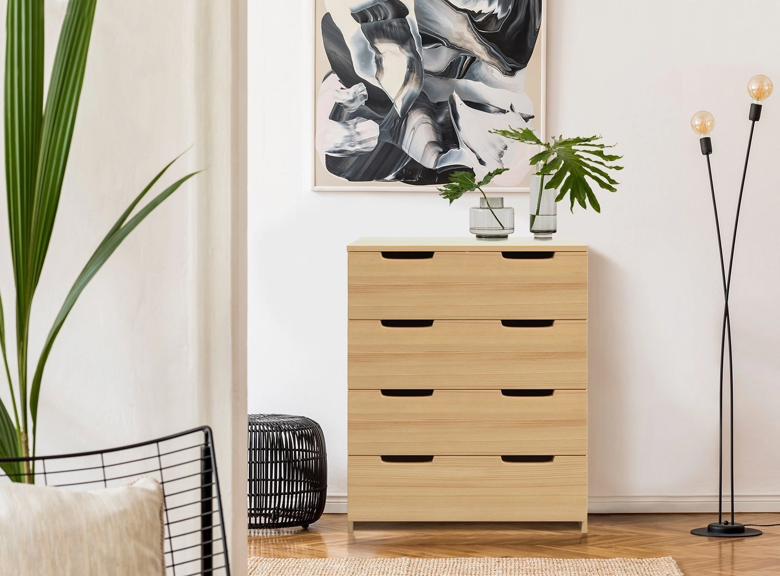 Prosta stylistyka, brak zdobień to niepodważalne atuty tej komody dla osób szukających mebla, który wpasuje się praktycznie w każdą stylistykę. Brak uchwytów, a konkretnie wycięcia we frontach szuflad nie tylko podkreślają nowoczesność, ale są również minimalizują ryzyko nieprzyjemnych uderzeń w wystające elementy mebli. Całość to przemyślany koncept nowoczesności, inspirowany uniwersalnym pięknem. To mebel niezwykle uniwersalny – do sypialni, salonu lub przedpokoju.
