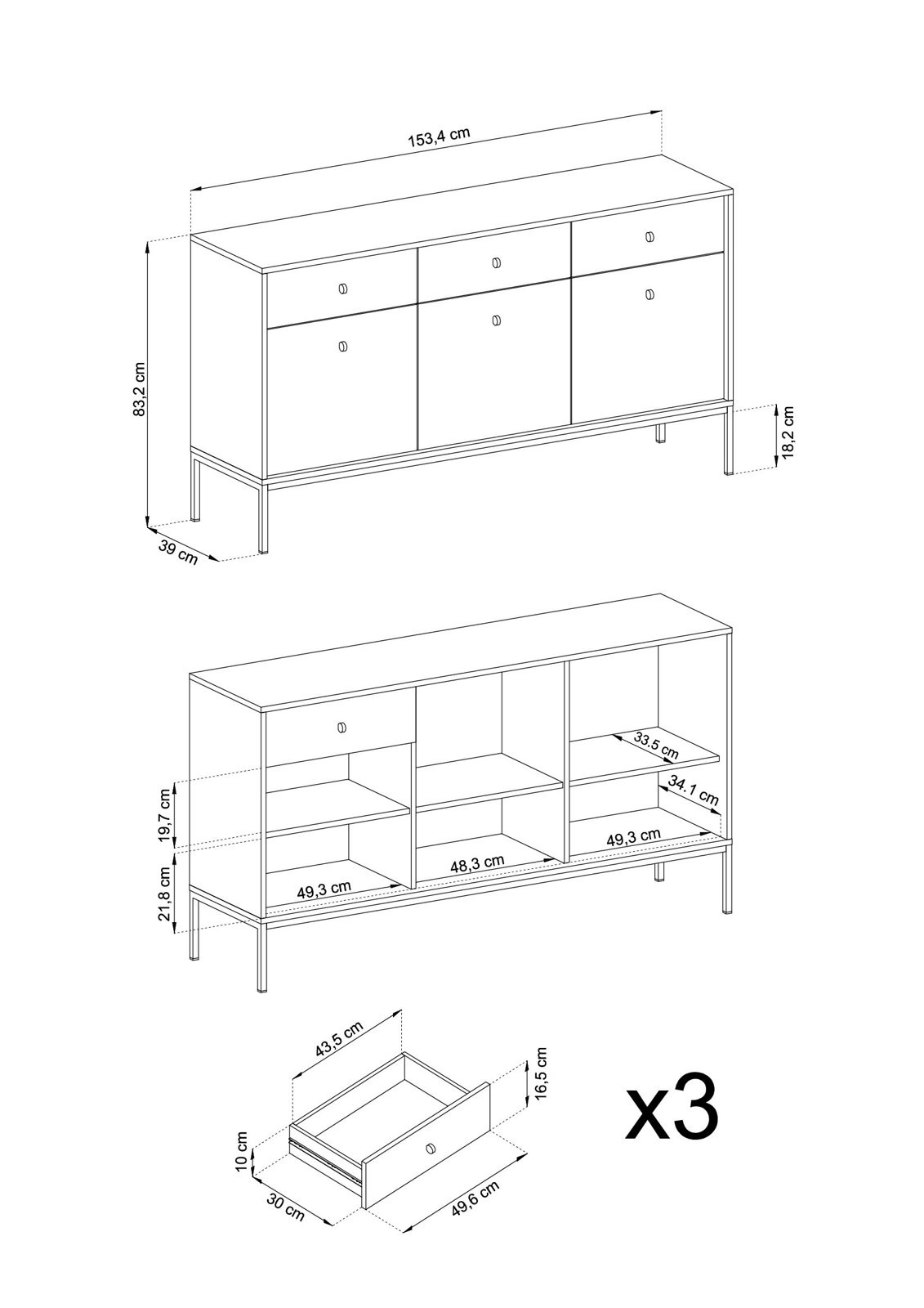 Przemyślany projekt sprawia, że komoda jest bardzo praktyczna oraz przestronna. Wymiary: szerokość aż 154 cm, wysokość 83 cm i głębokość 39 cm sprawią, że komoda bez wątpienia będzie odpowiedzią na Twoje wymagania. Komoda posiada trzy szuflady, w których z łatwością przechowasz zarówno większe rzeczy, jak i wszystkie niezbędne drobiazgi. Komoda posiada też sześć półek, na których położysz drobiazgi, które chcesz szczególnie wyeksponować. Nawet wypełniona po brzegi komoda zachowuje się stabilnie, ponieważ cała forma mebla jest oparta na czterech nogach. Pod komodą zmieści się każdy robot sprzątający, ponieważ jej konstrukcja osadzona jest na wysokich nóżkach. Ta zaleta ułatwia również tradycyjne odkurzanie, a także mycie podłogi mopem. Komoda fantastycznie będzie pasować nie tylko do sypialni, ale również do jadalni, salonu czy przedpokoju, ponieważ jest niebywale łatwa w aranżacji i praktyczna. Komoda jest pojemna, a jednocześnie ma dość uniwersalną wielkość, dzięki czemu bez żadnych przeszkód możesz wstawić ją do pomieszczeń o różnorodnych metrażach. Komoda, ozdobiona mocniejszymi dekoracjami, okaże się podstawowym i centralnym punktem wystroju, jednak może też być wprawnie wkomponowana w wyposażenie, które posiadasz już w swoim wnętrzu.