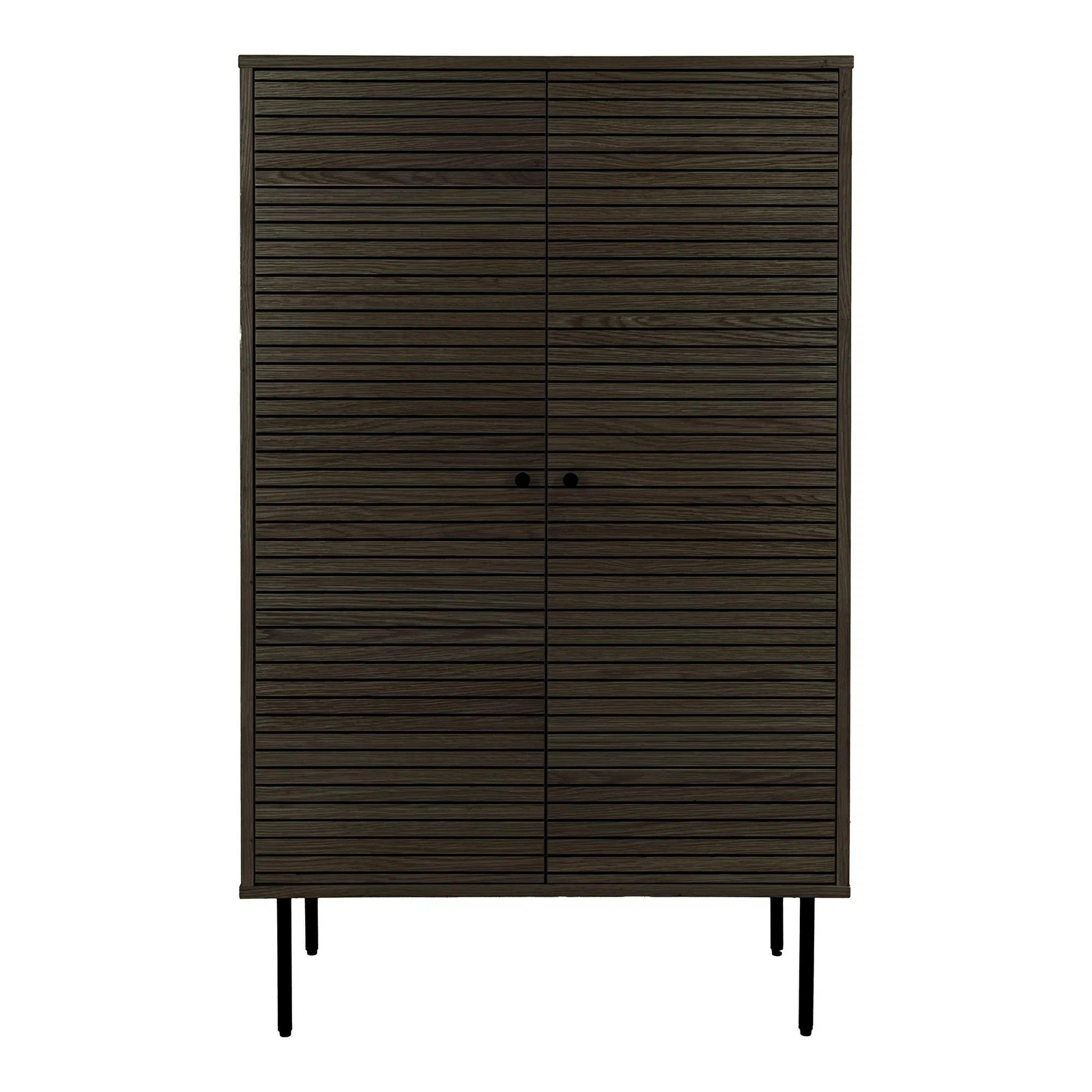 Komoda Kyoto marki House Nordic to wysoka, skandynawska komoda drewniana o szerokości 80 cm, wykończona forniren dębowym w dymionym odcieniu. Posiada ryflowane fronty, dwie pojemne szafki oraz czarne, wysokie stalowe nogi, dzięki którym mebel wygląda lekko i jest praktyczny w codziennym użytkowaniu.