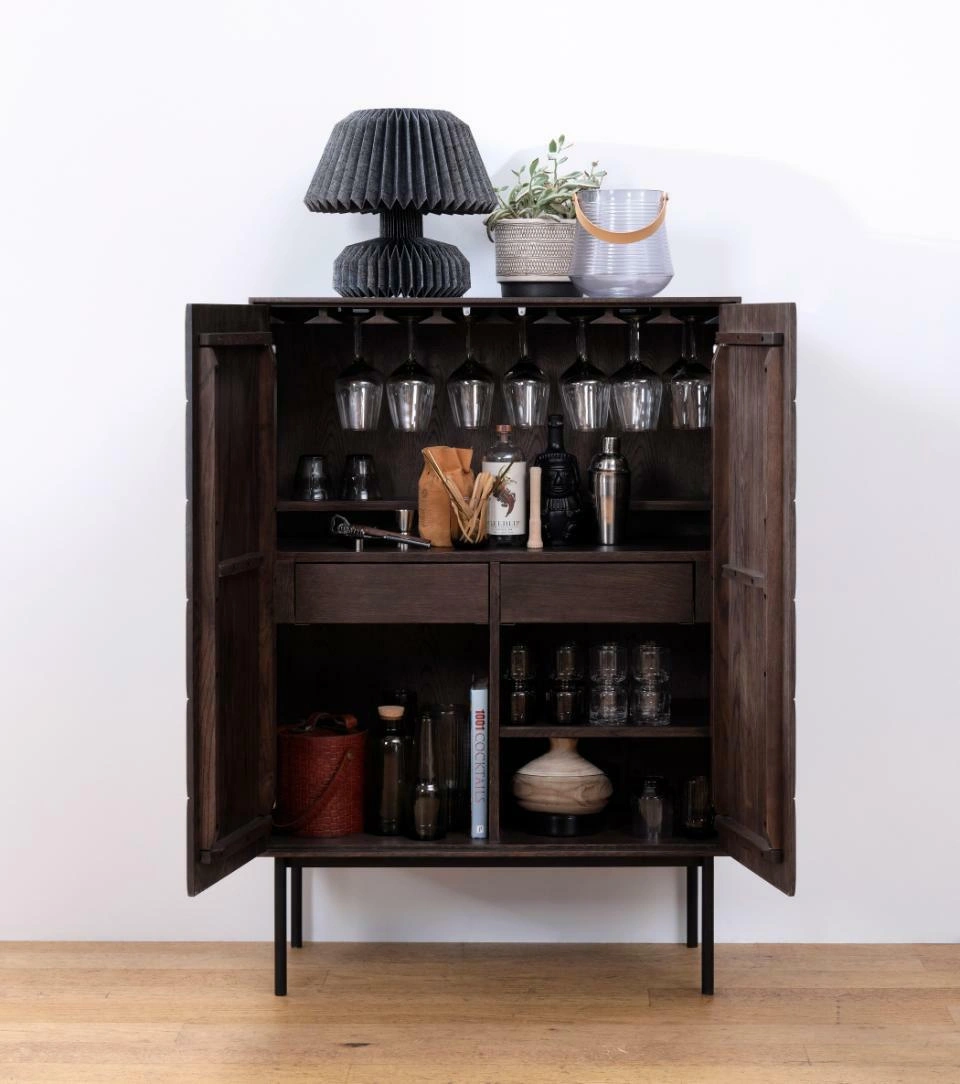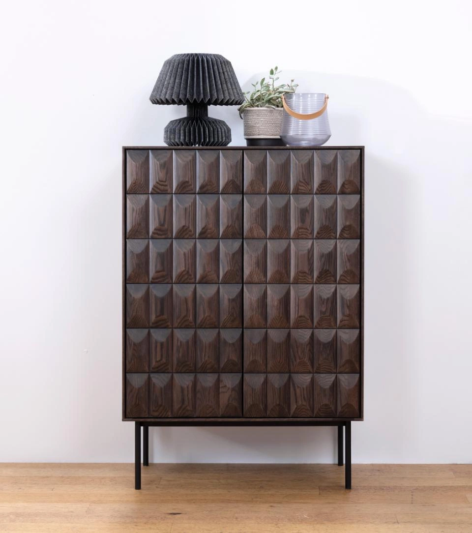 Komoda Latina wysoka barek z szufladami marki UNIQUE Furniture A/S to elegancka komoda do salonu o wysokości 130 cm i szerokości 90 cm, zaprojektowana jako funkcjonalny barek z ukrytym miejscem do przechowywania. Fornirowany, czarny dąb w półmacie oraz stabilna stalowa podstawa w czerni tworzą wysmakowaną, nowoczesną bryłę, która nada wnętrzu charakteru wyrafinowanego lounge’u.