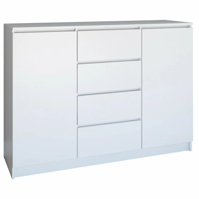 Komoda została wyposażona w bez uchwytowe fronty szuflad oraz drzwi zapewniają wygodne użytkowanie i podkreślą modernistyczny charakter wnętrza. Dzięki temu organizacja przestrzeni staje się łatwa i wygodna. Komoda reprezentuje najwyższe standardy jakości i solidności. Wykonana z płyty wiórowej o grubości 16 mm, zapewnia trwałość i stabilność, a obrzeża – wykończone tworzywem PCV charakteryzującym się dużą wytrzymałością mechaniczną i chemiczną.Dzięki swojemu nowoczesnemu designowi, wysokiej jakości wykonaniu i polskiemu pochodzeniu, komoda stanowi doskonały wybór dla tych, którzy cenią sobie zarówno funkcjonalność, jak i estetykę w swoim domu.