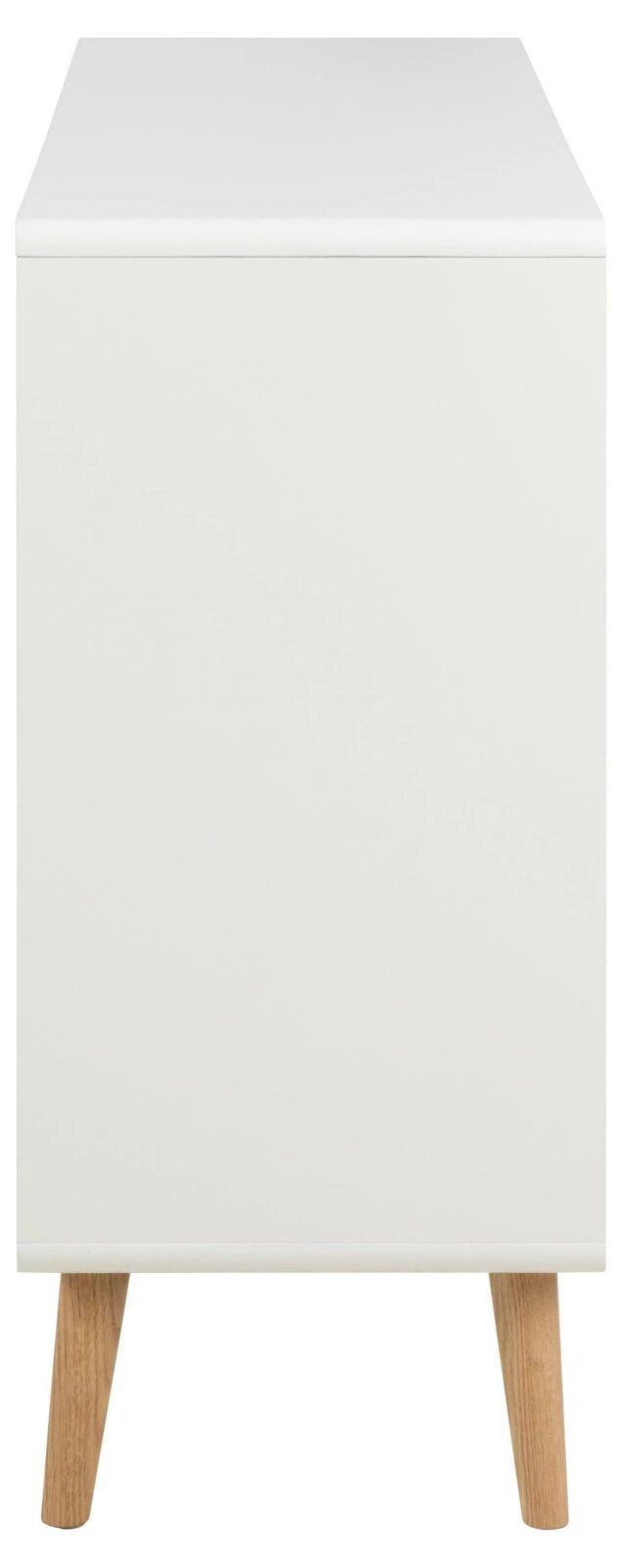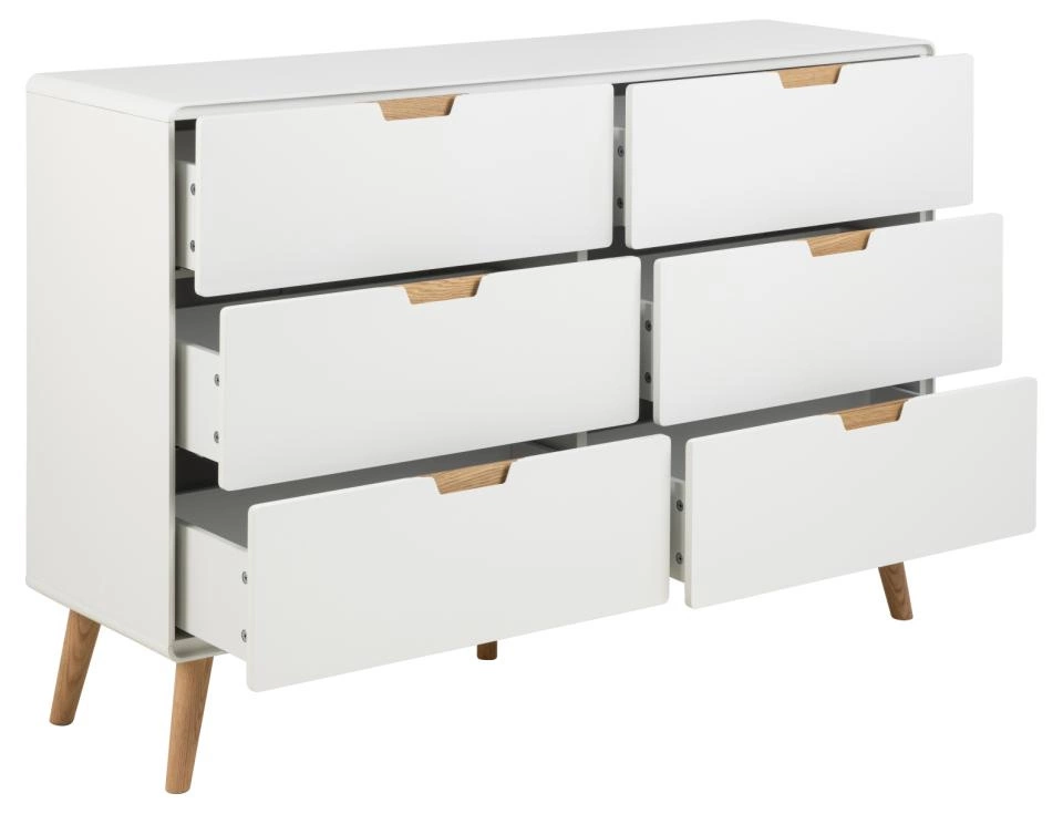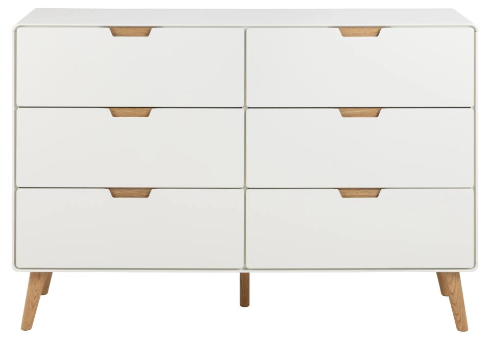 Prezentujemy Państwu komodę Lowell, która swoją prostotą i funkcjonalnością sprawdzi się w każdym pomieszczeniu. Komoda została wykonana z płyty MDF, natomiast nogi komody z solidnego drewna dębowego. Sześć przestronnych szuflad pomalowanych na biało z cichym domykiem umożliwia wygodne przechowywanie ubrań, zabawek czy książek. Stożkowe nogi z dębu dodają meblowi lekkości i elegancji. Biała komoda z dębowymi elementami doskonale wpasuje się w każde wnętrze, nadając mu skandynawskiego charakteru.