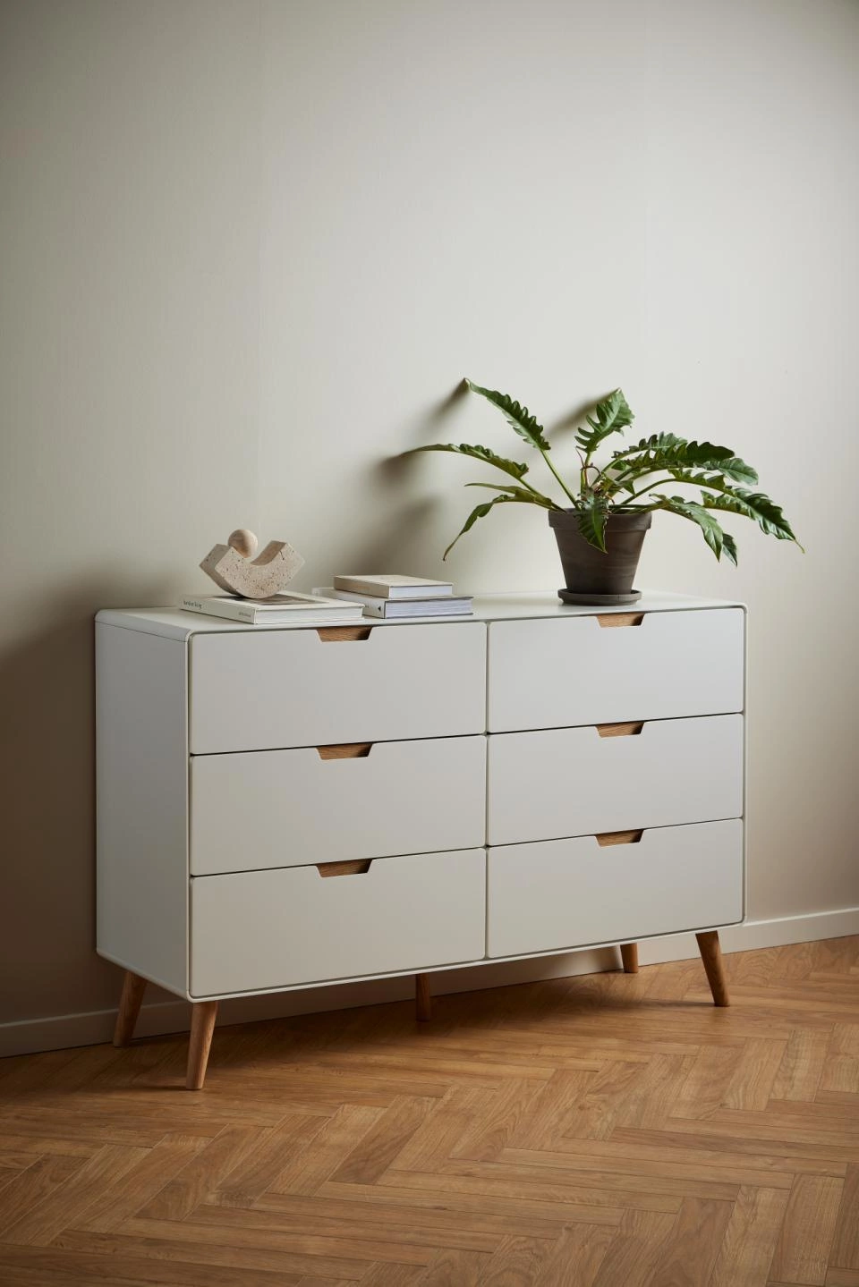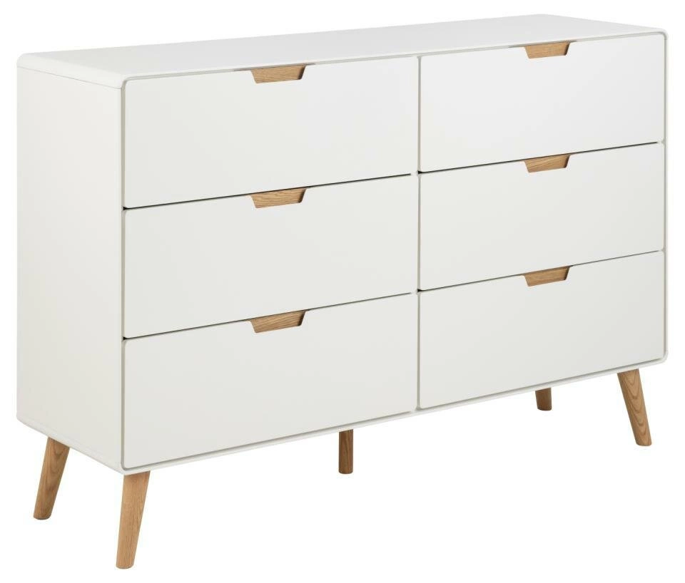 Prezentujemy Państwu komodę Lowell, która swoją prostotą i funkcjonalnością sprawdzi się w każdym pomieszczeniu. Komoda została wykonana z płyty MDF, natomiast nogi komody z solidnego drewna dębowego. Sześć przestronnych szuflad pomalowanych na biało z cichym domykiem umożliwia wygodne przechowywanie ubrań, zabawek czy książek. Stożkowe nogi z dębu dodają meblowi lekkości i elegancji. Biała komoda z dębowymi elementami doskonale wpasuje się w każde wnętrze, nadając mu skandynawskiego charakteru.