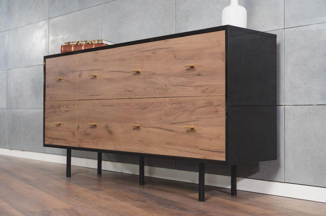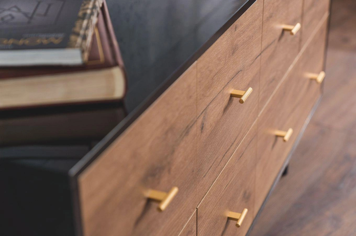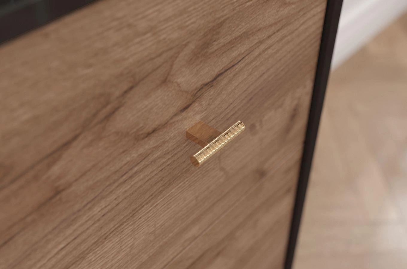 Każdy element Twojej przestrzeni przedstawia swoją własną historię. Często wybór odpowiedniego mebla stawia nas przed wyborem między praktycznością a estetyką. Jednak nie zawsze musi tak być. Komoda MAUD to nowoczesny mebel, który swoim niepowtarzalnym designem nawiązuje do elegancji z epoki modernizmu. Zestawienie czarnego korpusu lakierowanego na wysoki połysk oraz dębowych frontów w charakterystycznym odcieniu gwarantuje niepowtarzalny styl, który sprawdzi się w większości pomieszczeń. W myśli idei Gdyby nie detale, nie byłoby wielkich efektów, komoda posiada złote uchwyty, dopełniające całość konstrukcji. Czarne, proste nogi nadają pozornie masywnej bryle komody, niezwykłej lekkości. Fronty szuflad wycięto tak, że na przodzie mebla uzyskano jednolity rysunek drewna. Motyw natury to coś, co pozwala wprowadzić do wnętrza niezwykle ciepłą, spokojną aurę.