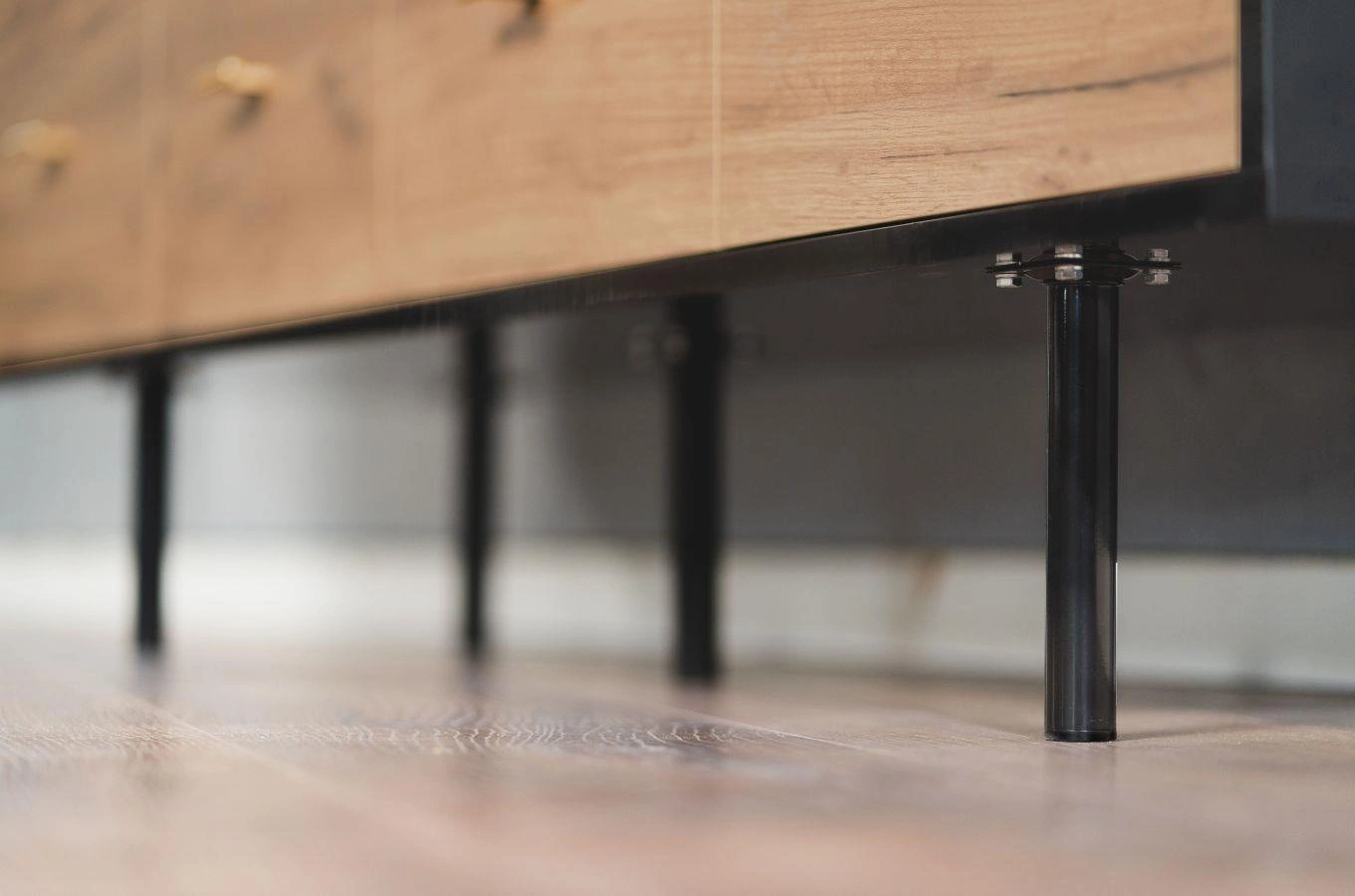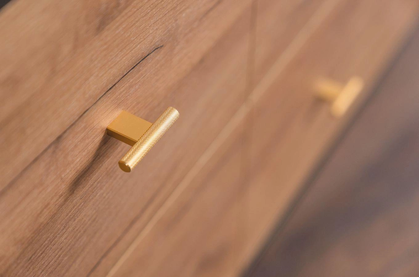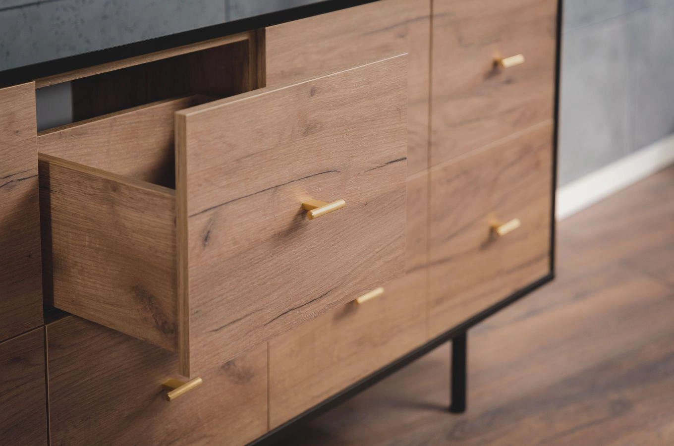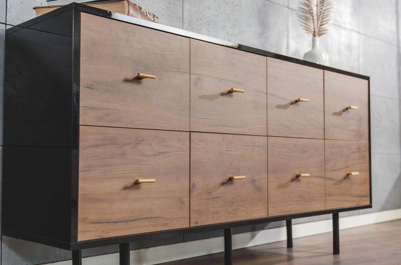 Każdy element Twojej przestrzeni przedstawia swoją własną historię. Często wybór odpowiedniego mebla stawia nas przed wyborem między praktycznością a estetyką. Jednak nie zawsze musi tak być. Komoda MAUD to nowoczesny mebel, który swoim niepowtarzalnym designem nawiązuje do elegancji z epoki modernizmu. Zestawienie czarnego korpusu lakierowanego na wysoki połysk oraz dębowych frontów w charakterystycznym odcieniu gwarantuje niepowtarzalny styl, który sprawdzi się w większości pomieszczeń. W myśli idei Gdyby nie detale, nie byłoby wielkich efektów, komoda posiada złote uchwyty, dopełniające całość konstrukcji. Czarne, proste nogi nadają pozornie masywnej bryle komody, niezwykłej lekkości. Fronty szuflad wycięto tak, że na przodzie mebla uzyskano jednolity rysunek drewna. Motyw natury to coś, co pozwala wprowadzić do wnętrza niezwykle ciepłą, spokojną aurę.